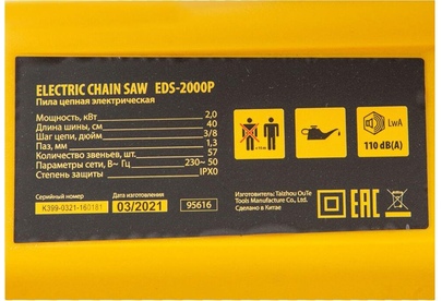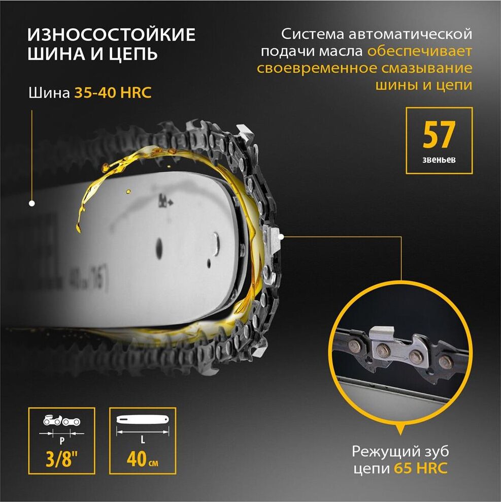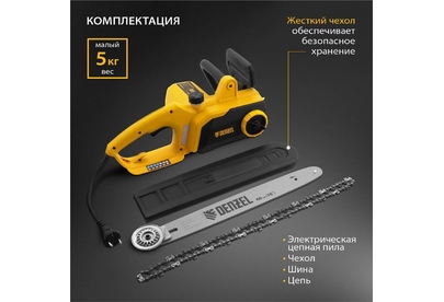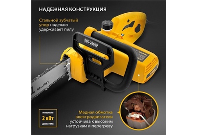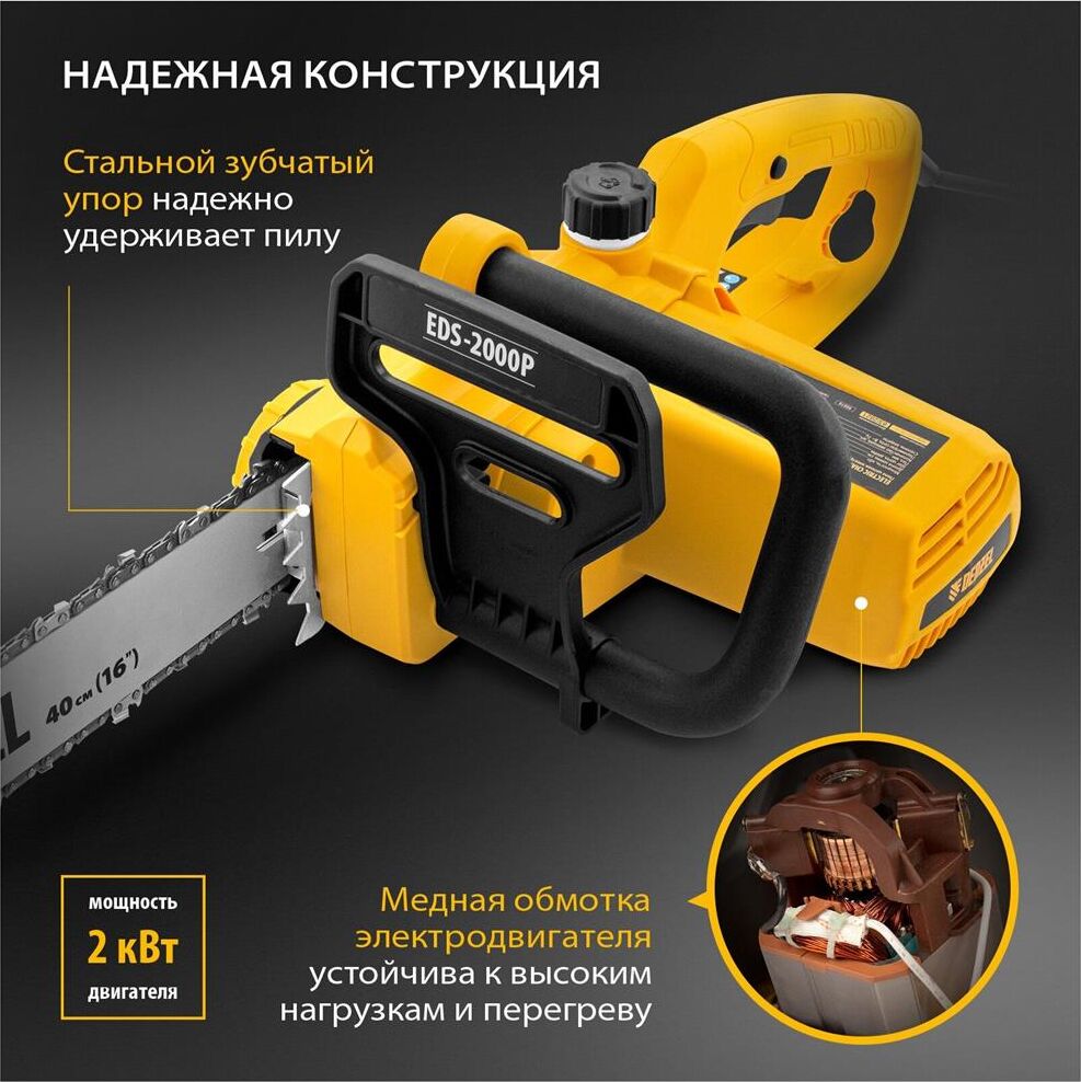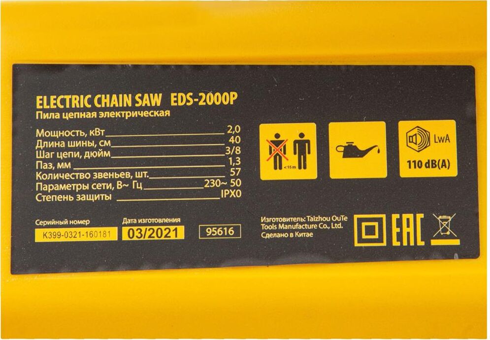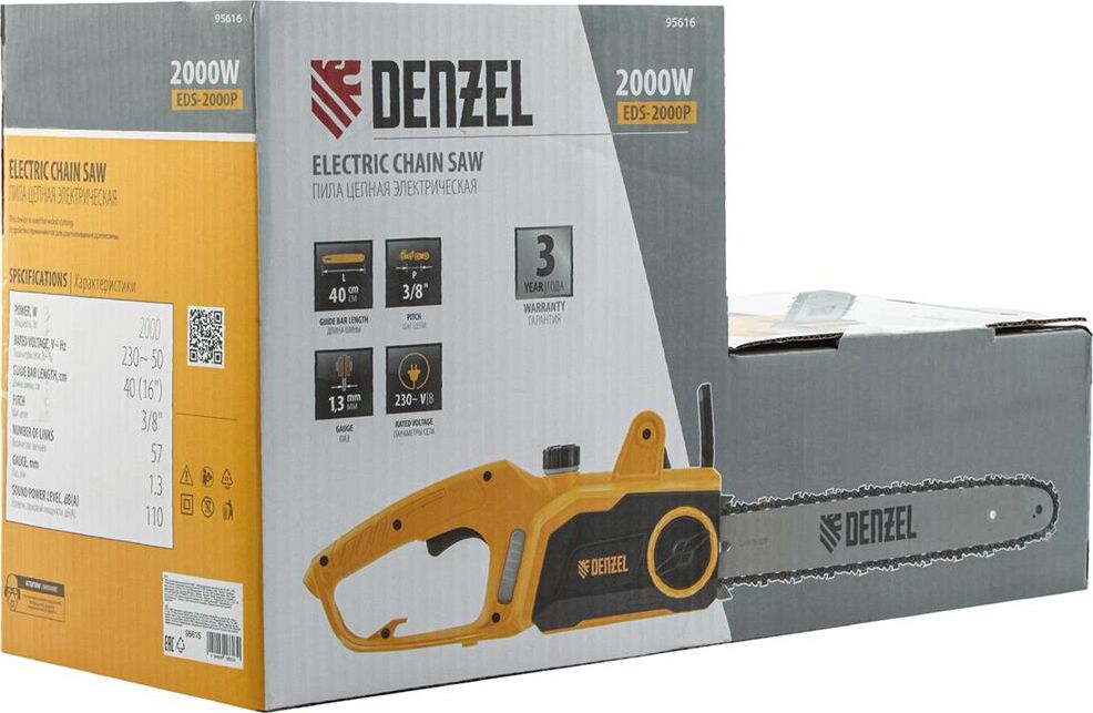 DENZEL Пила цепная электрическая EDS-2000P, 2 кВт,поперечная, шина 40 см, шаг 3/8, паз 1.3 мм, 57 зв