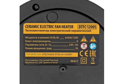 Тепловентилятор Denzel DTFC1200S с керамическим нагревательным элементом и функцией вращения работает в 1 из 3 режимов: вентиляция, нагрев на мощности 600 Вт и нагрев на мощности 1200 Вт. Равномерно прогревает окружающее пространство благодаря функции осцилляции (вращения). Создает комфортный микроклимат, поскольку не сжигает пыль и не пересушивает воздух. Предназначен для обогрева помещений площадью до 12 м2, используется в бытовых целях.ПреимуществаПоддержание заданной температуры — термостат обеспечивает автоматическое включение и отключение тепловентилятора.Удобный контроль работы — на панели управления имеется световой индикатор.Режим осцилляции — данная функция позволяет менять угол направленности воздушного потока до 70° для равномерного прогрева помещения.Уникальный дизайн — DTFC1200S является единственным тепловентилятор в России в таком исполнении.Безопасность — встроенная система защиты отключает устройство при опрокидывании.Термозащита — в случае перегрева тепловентилятор автоматически выключается
