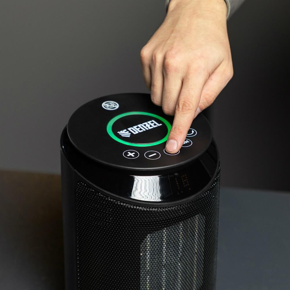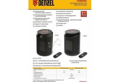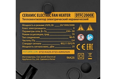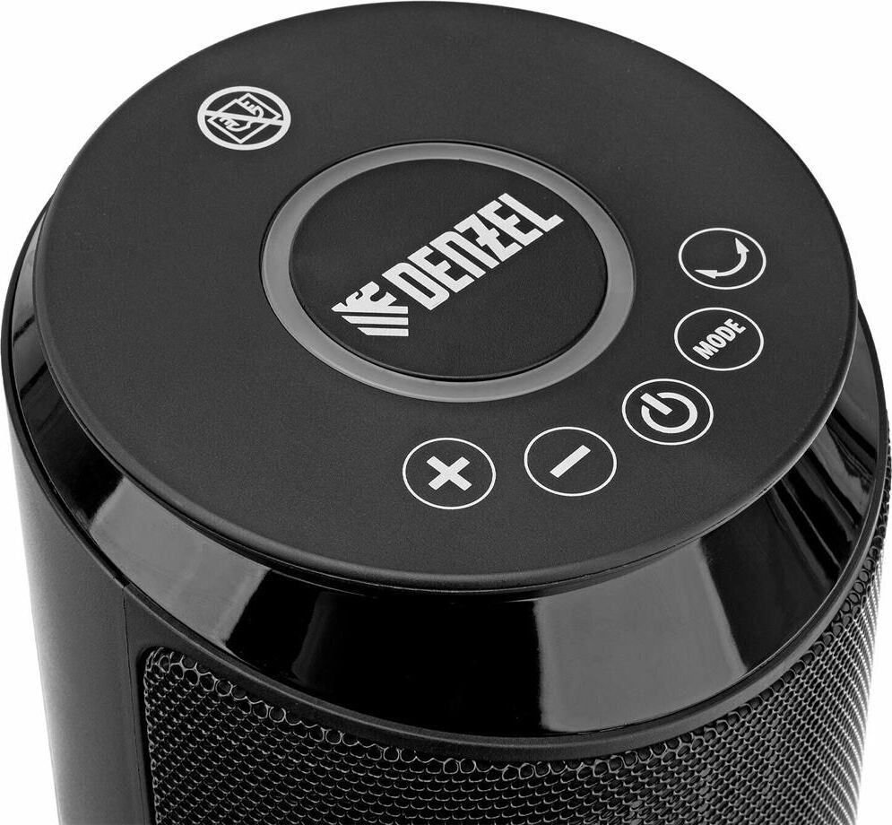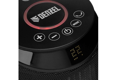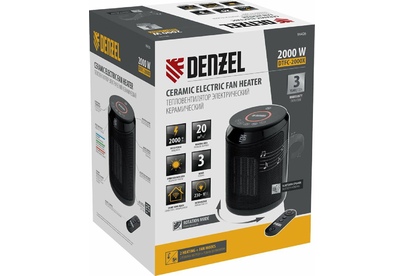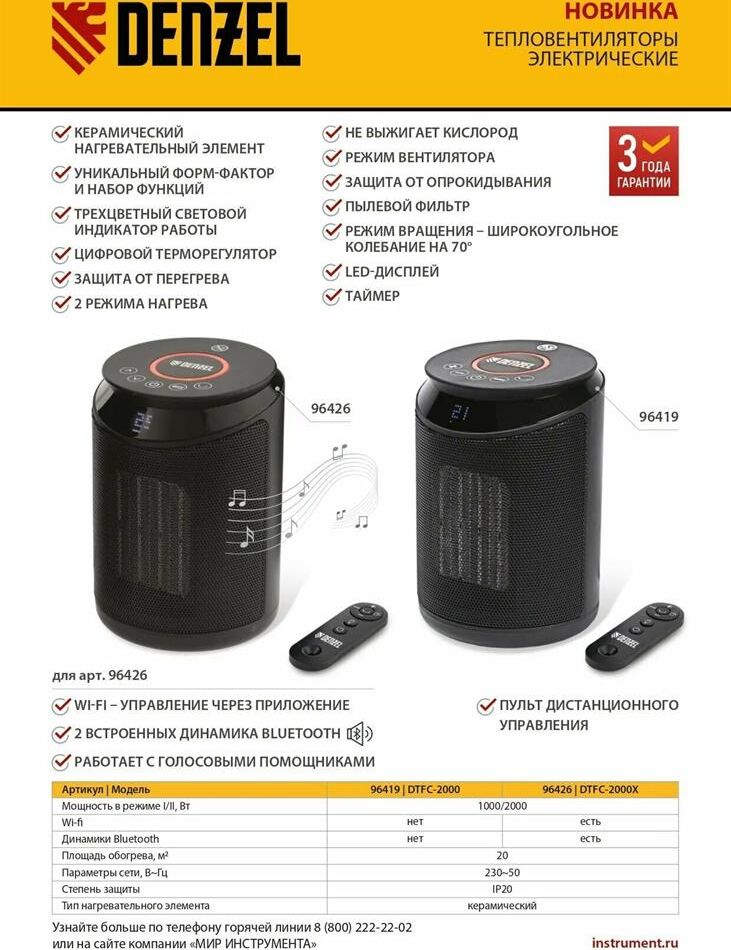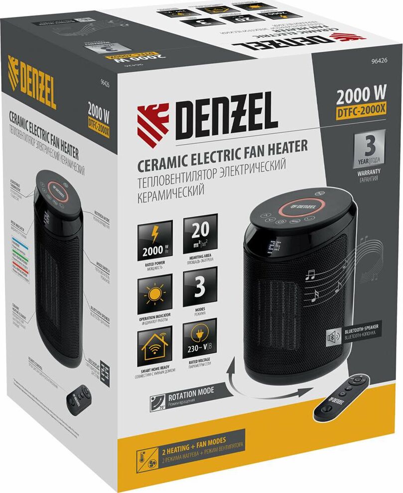 Тепловентилятор Denzel DTFC2000X 96426 мощностью 2 кВт, с керамическим нагревательным элементом, пультом и динамиком, с функцией вращения и возможностью подключения по WiFi, имеет 3 режима работы. Предназначен для обогрева и вентилирования бытовых помещений площадью до 20 м2. Позволяет поддерживать комфортный климатический режим в любое время года. Способен работать в режиме вентиляции, обогрева теплым (1000 Вт) и горячим воздухом (2000 Вт). В комплект поставки входит пульт дистанционного управления. Также можно подключить тепловентилятор к сети Интернет и управлять им из любой точки мира при помощи телефона или планшета с установленным приложением.ПреимуществаПодключение по WiFi — управлять моделью DTFC2000X можно дистанционно через приложение Smart life (в том числе устанавливать время работы).Встроенный динамик — вы можете включать любимые треки через соединение Bluetooth.Точная настройка — цифровой терморегулятор позволяет установить необходимую температуру.Режим осцилляции — данная функция позволяет меня