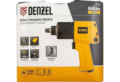 Ударный пневмогайковерт Denzel IW860 57473 с присоединительным квадратом 1/2?, скоростью вращения шпинделя 7000 об/мин и максимальным крутящим моментом 868 Нм служит для монтажа и демонтажа резьбовых соединений, в том числе высоконагруженных. Предусмотрено 10 режимов работы, что позволяет точно установить оптимальную скорость. Инструмент предназначен для профессионального использования в цехе, на строительной площадке или в автосервисе.Преимущества Эффективность — ударный механизм Twin Hammer помогает откручивать даже заржавевший или закисший крепеж. Высокая прочность — металлический корпус устойчив к механическим повреждениям. Механизм реверса — можно быстро перейти от закручивания к извлечению крепежа. Простая подготовка к работе — гайковерт подключается к компрессору при помощи быстроразъемного соединения. Комфортная работа — отработанный воздух выходит через отверстие в нижней части рукоятки и не мешает пользователю.