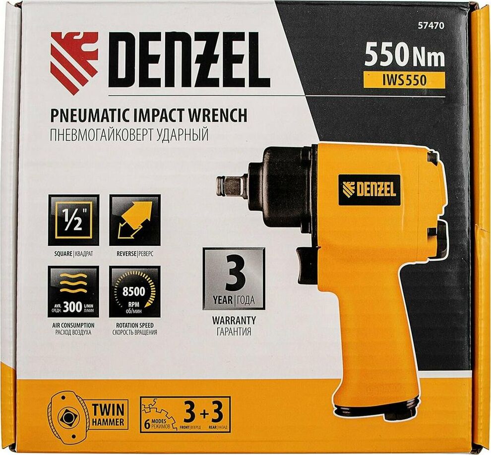 Ударный пневмогайковерт Denzel IWS550 Compact 57470 с присоединительным квадратом 1/2? обеспечивает скорость вращения шпинделя 8500 об/мин и максимальный крутящий момент 550 Нм. Используется для закручивания и выкручивания резьбового крепежа. Благодаря встроенному механизму Twin Hammer инструмент справляется даже с проржавевшими соединениями. Пневмогайковерт применяется для решения профессиональных задач в цехах, на строительных площадках и в автосервисах.Преимущества Прочность и долговечность — металлический корпус устойчив к механическим повреждениям, высоким нагрузкам и коррозии. 6 режимов работы — можно регулировать усилие затягивания в зависимости от типа крепежа. Функция реверса — можно быстро изменить направление вращения патрона для перехода от закручивания к выкручиванию крепежа. Продуманная конструкция — отработанный воздух выходит через отверстие в нижней части рукоятки и не мешает мастеру при выполнении работ.