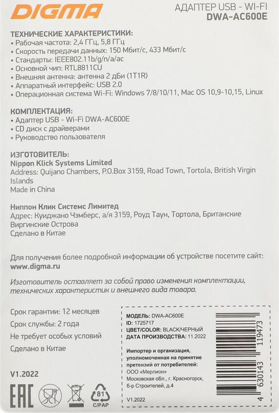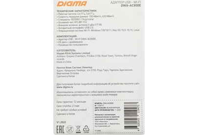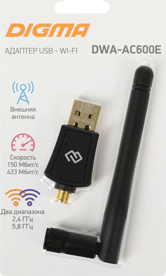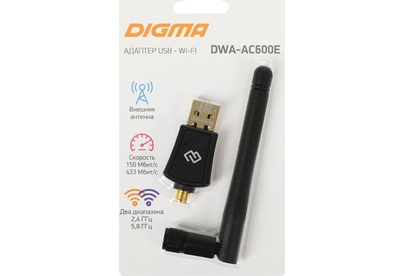 DIGMA Сетевой адаптер Wi-Fi DWA-AC600E AC600 USB 2.0 (ант.внеш.съем) 1ант