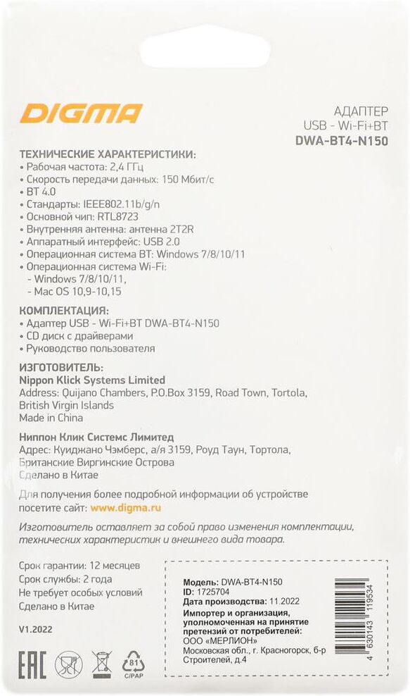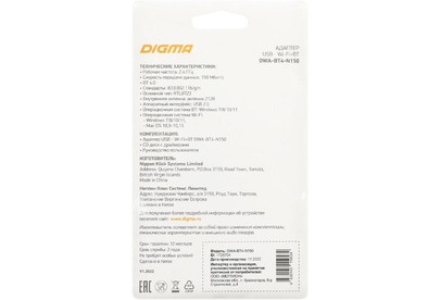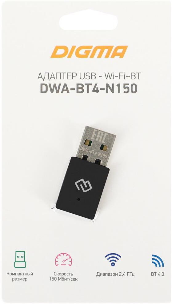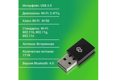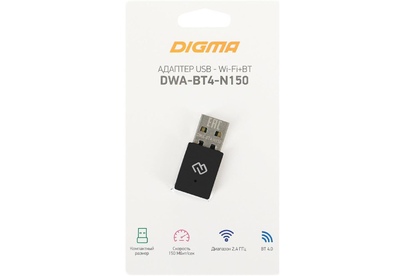 DIGMA Сетевой адаптер WiFi + Bluetooth DWA-BT4-N150 N150 USB 2.0 (ант.внутр.) 1ант. (упак.:1шт)