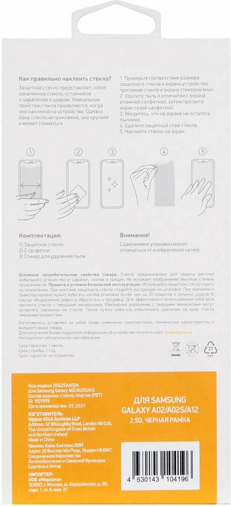 DIGMA Защитное стекло для экрана 2.5D черный Samsung Galaxy A02/A02s/A12/A03s 1шт. (DGG2SAA02A)