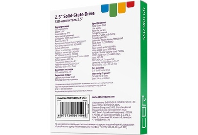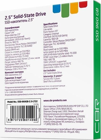 [накопитель] CBR SSD-960GB-2.5-LT22, Внутренний SSD-накопитель, серия "Lite", 960 GB, 2.5", SATA III 6 Gbit/s, SM2259XT, 3D TLC NAND, R/W speed up to 550/520 MB/s, TBW (TB) 480