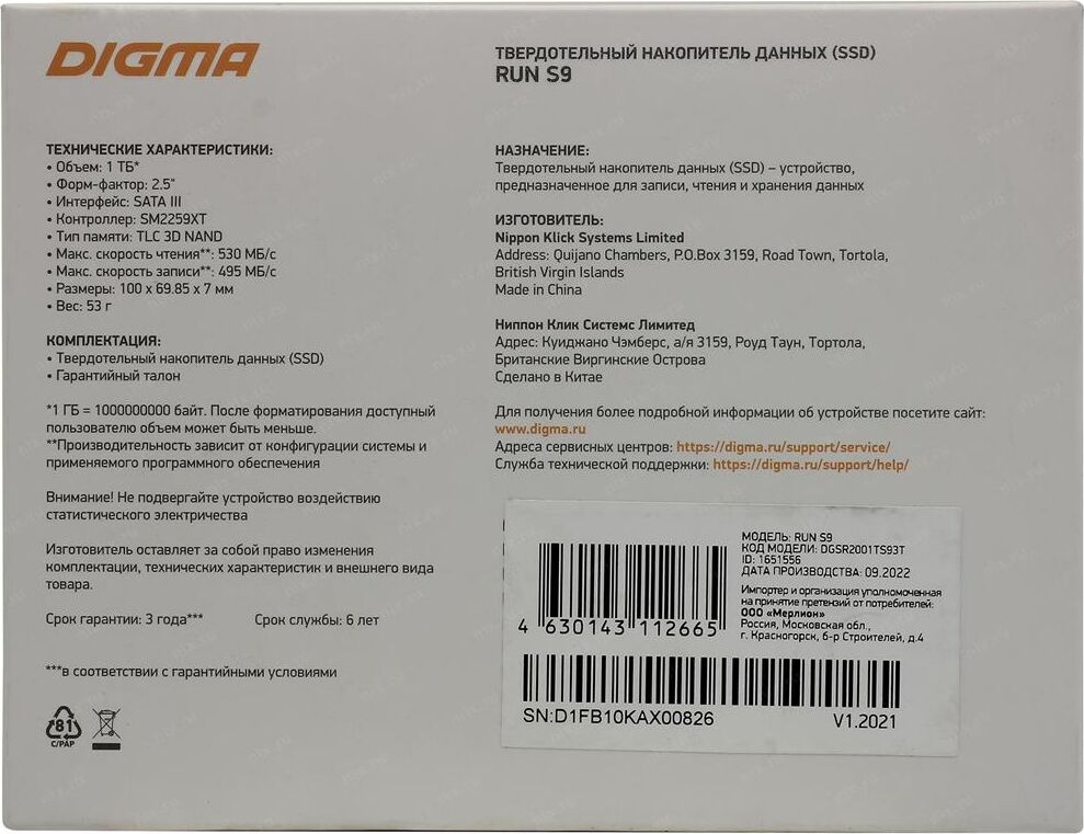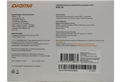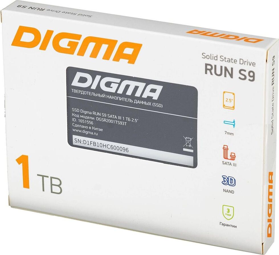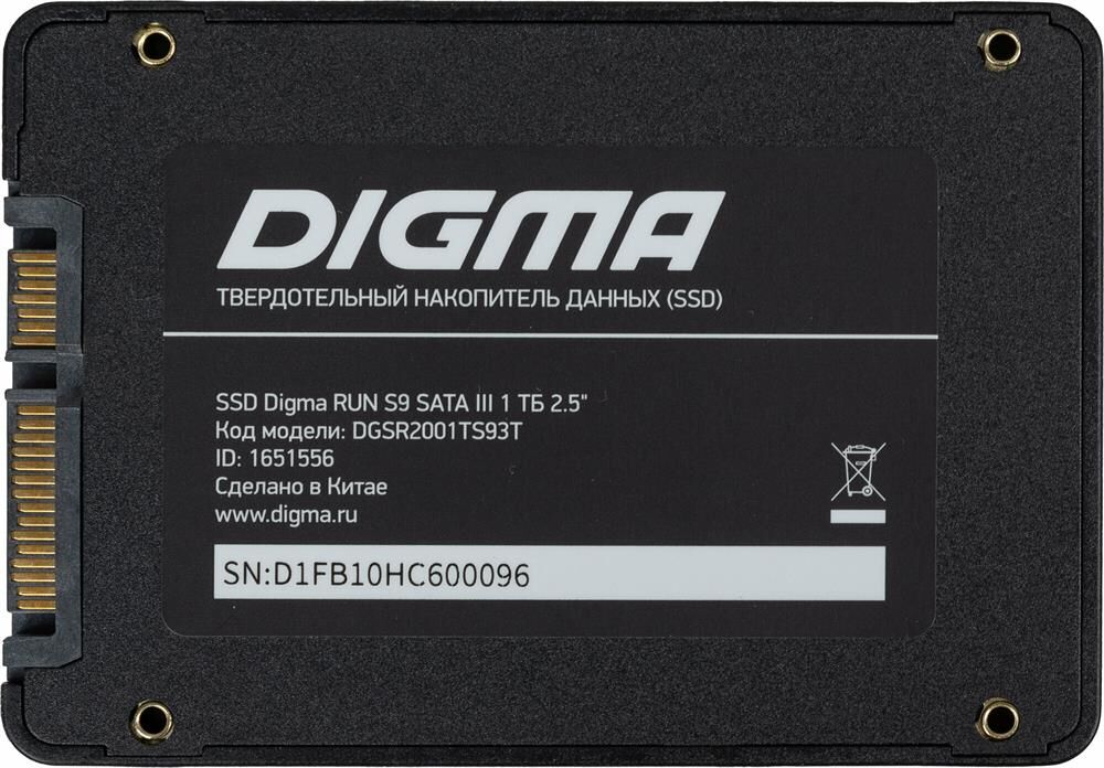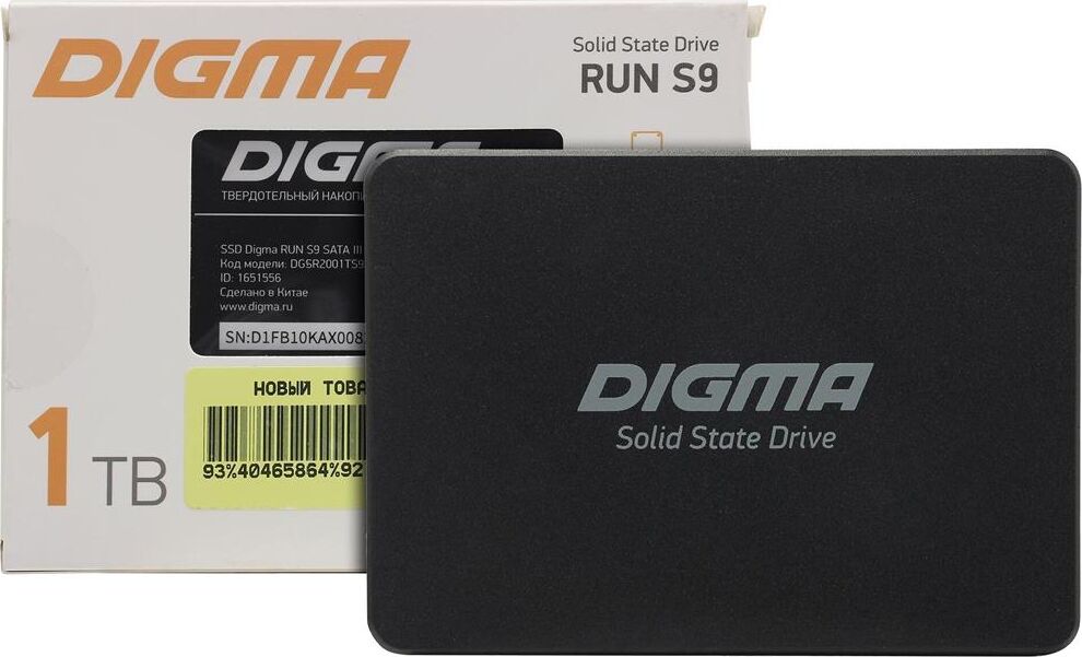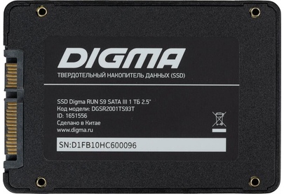 Диск SSD DIGMA SSD накопитель Run S9 DGSR2001TS93T 1ТБ, 2.5", SATA III, SATA, rtl