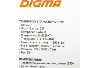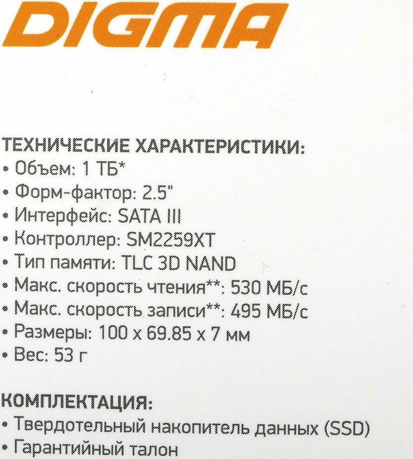 Время наработки на отказ: 1500000. Контроллер NAND: Silicon Motion SM2259XT. Максимальная скорость записи: 495. Максимальная скорость произвольной записи (4KB) (IOPS): 75000. Максимальная скорость чтения: 530. Объем накопителя: 1024. Максимальная скорость произвольного чтения (4KB) (IOPS): 60000. Тип жесткого диска: SSD. Тип памяти NAND: TLC. Толщина товара: 7. Форм-фактор: 2.5". Тип поставки: rtl. Разъем: SATA. Габариты упаковки (ед) ДхШхВ: 0.135x0.1x0.01. Вес упаковки (ед): 0.07. Вес устройства: 50. Материал корпуса: пластик. Поддержка TRIM: есть. Длина товара: 100. Ширина товара: 70. Интерфейс: SATA III. Структура памяти NAND: 3D. Гарантия: 36 мес.. Ресурс TBW: 480 ТБ. Предназначен: для ПК, для ноутбука. Ресурс: TBW 480 ТБ; время наработки: 1500000 ч. Память: тип NAND: TLC. Объем: 1024 ГБ; интерфейс: SATA III. Особенности: для ПК, для ноутбука; TRIM. Скорость: чтения до 530 МБ/с, записи до 495 МБ/с. Форм-фактор: 2.5"; разъем SATA; толщина 7 мм