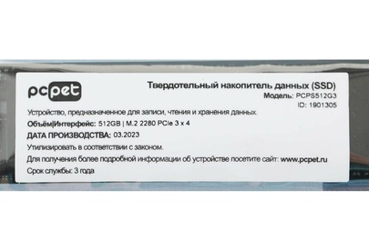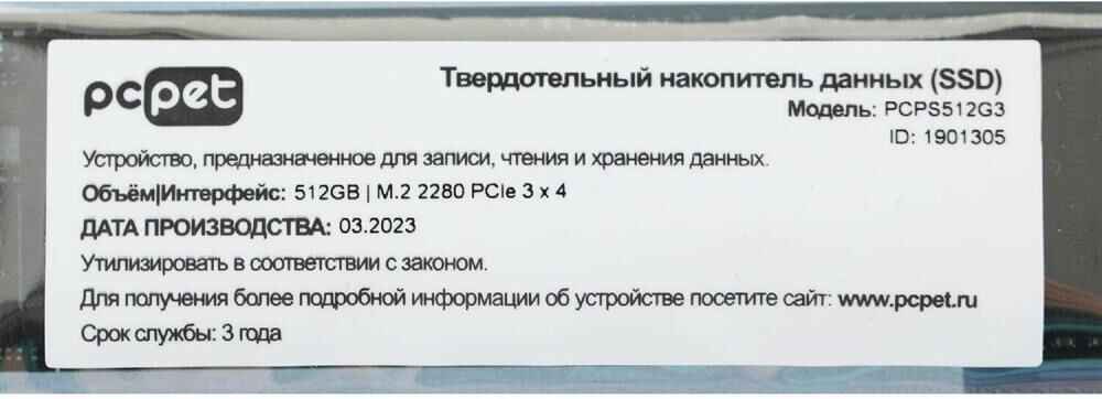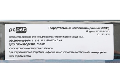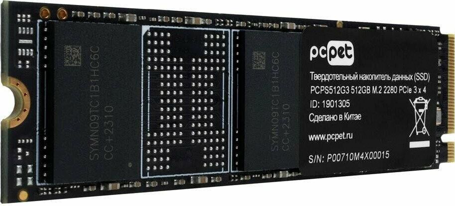 Диск SSD PC PET SSD накопитель PCPS512G3 512ГБ, M.2 2280, PCIe 3.0 x4, NVMe, M.2, oem