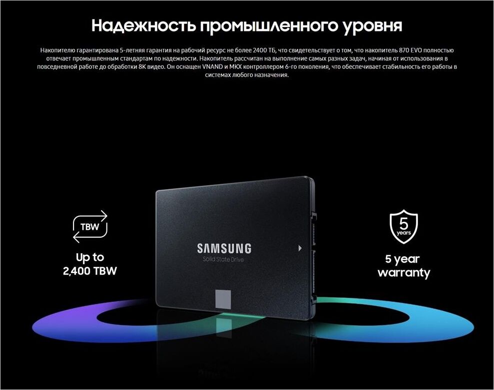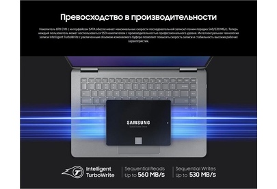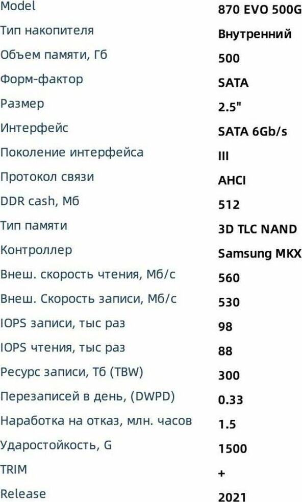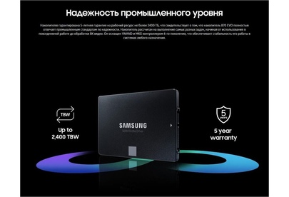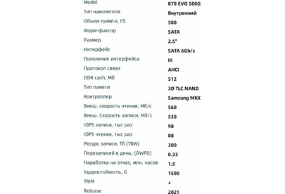 Объем 500 Гб, форм-фактор 2.5", интерфейс SATA III 6Gb/s, скорость записи до: 530 MБ/с, скорость чтения до: 560 MБ/с, MZ-77E500BW