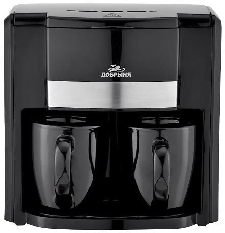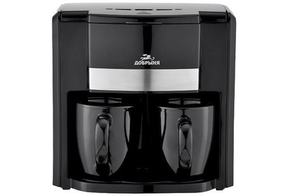Кофеварка капельная; Основной цвет: Черный; Дополнительный цвет: Серебристый; Современный дизайн; Легкость в эксплуатации; Съемный фильтр для кофе; Автоотключение; Объем резервуара для воды: 300 мл; Объем резервуара для кофе: 300 мл; Материал корпуса: Пластик; Используемый кофе: молотый; Световой индикатор работы; Длина сетевого шнура: 1м; Прорезиненные ножки; Две керамические кружки; Мощность: 500Вт; Электропитание 220-240В, 50Гц.