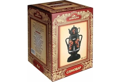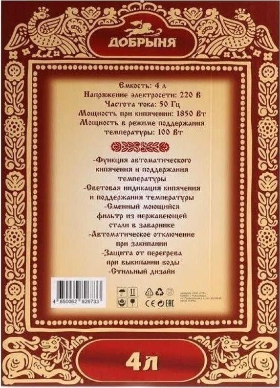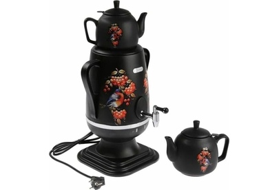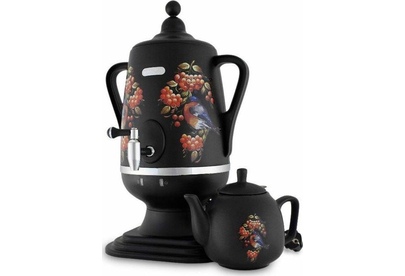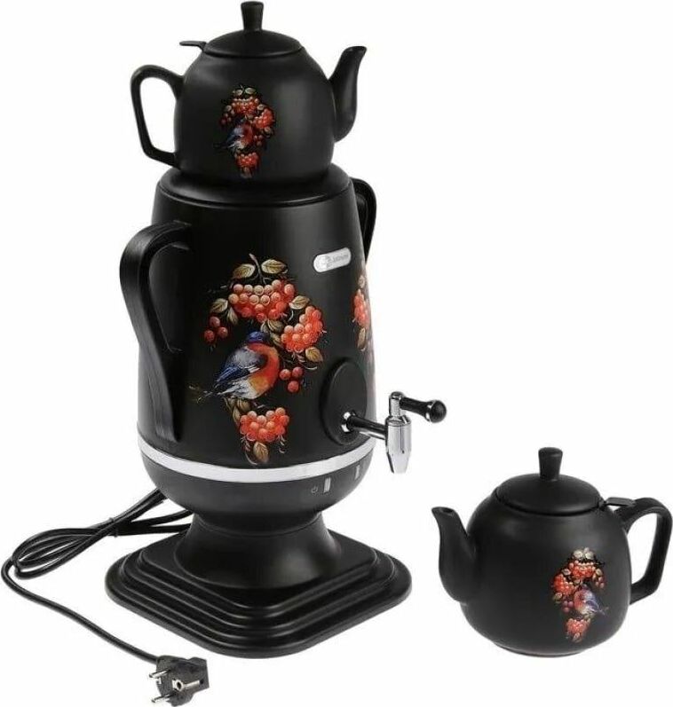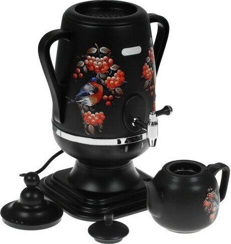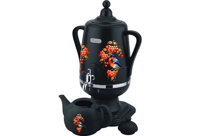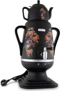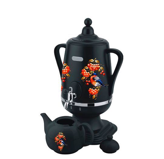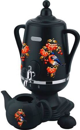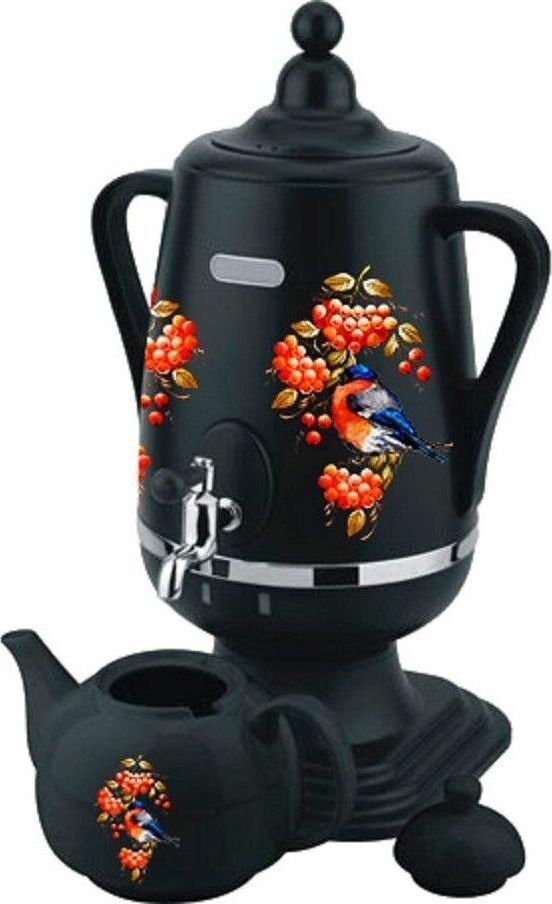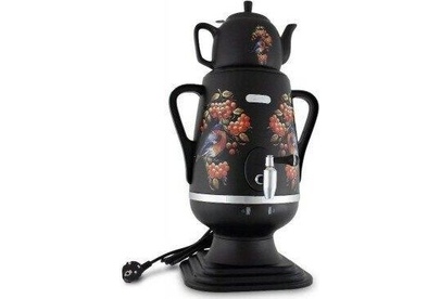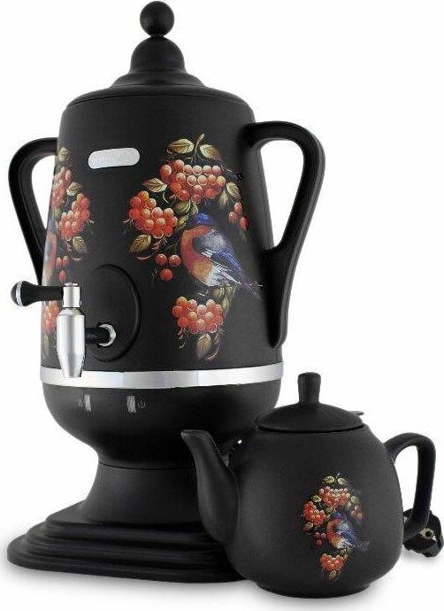Электросамовар * Объём: 4 л * Материал: пластик * Цвет: черный с росписью * Керамический заварочный чайник 1 л со съёмным фильтром из нержавеющей стали в комплекте/высота 145мм * Хромированный кран * Функция термопота * Мощность при закипании 1850 Вт * Мощность в режиме подогрева 100 Вт * Дисковый нагреватель * световая индикация работы * автоматическое отключение * защита от перегрева при выкипании воды *