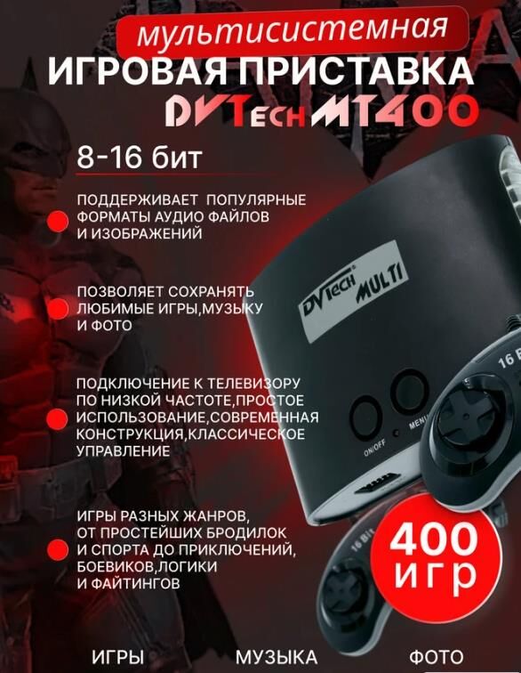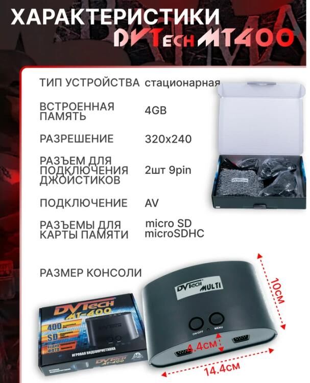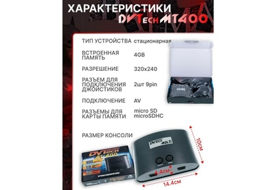 Погрузитесь в яркий и красочный мир классических 8- и 16-битных игр вместе с игровой мультиплатформенной приставкой DVTech MT 400 игр. Вы можете не только играть в игры, но и слушать музыку и просматривать фото. Ретро приставка DVTech поддерживает популярные форматы аудио файлов и изображений. • Совместимость с картами памяти формата microSD и microSDHC до 32 GB, записывайте любимые игры, музыку и фото, создавайте собственную коллекцию. • 400 предустановленных игр разных жанров, от простейших бродилок и спорта до приключений, боевиков, логики и файтингов; • Подключение к телевизору по низкой частоте, простое использование, современная конструкция, классическое управление; • Поддержка форматов: - Игры: 8 бит (.nes), 16 бит (.bin); - Аудио: mp3, aac, ape, flac, wav, amr; - Изображения: bmp, jpg, png, gif.