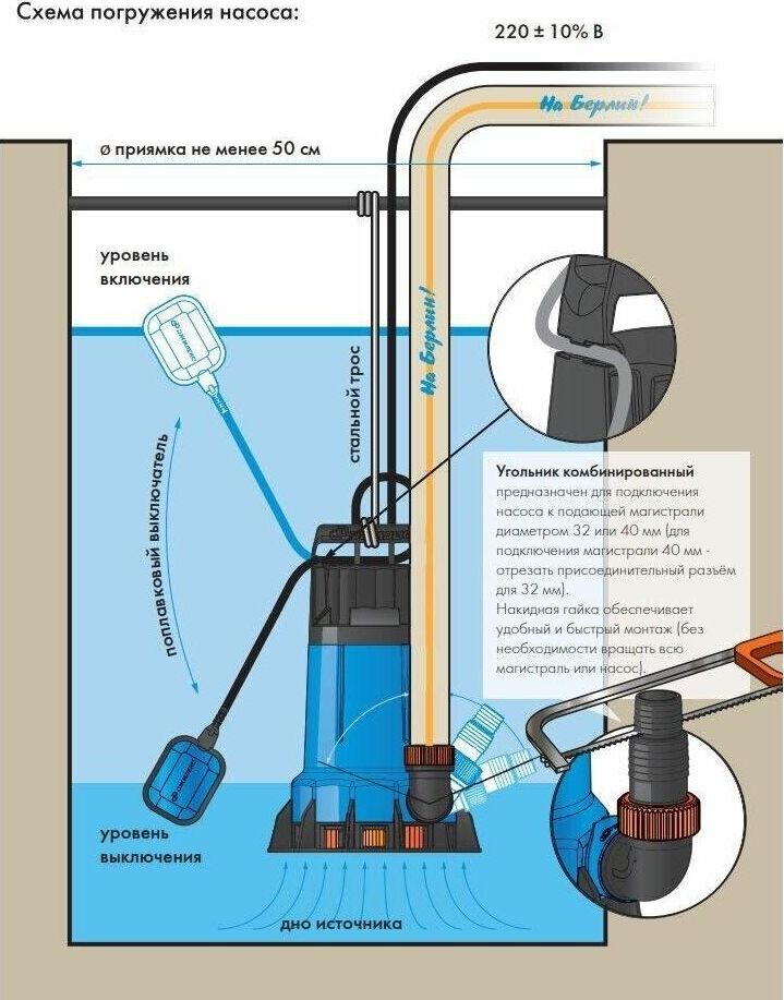 Серия насоса Тугунок Тип погружной Тип погружного насоса фекальный Качество воды грязная Материал корпуса насоса пластик Максимальный расход 140 л/мин. Размер фильтруемых частиц 32 мм Длина кабеля 5 метров Глубина погружения под воду 8 метров Температура перекачиваемой воды от +1 до +35 °C Мощность потребляемая 400 Вт Потребляемый ток 1.8 А Максимальная глубина всасывания 8 метров Диаметр подсоединяемых шлангов 40 мм Диаметр подсоединяемых шлангов 32 мм Диаметр подсоединяемых шлангов 25 мм Напряжение 220 ± 10% В Уровень защиты IP x8