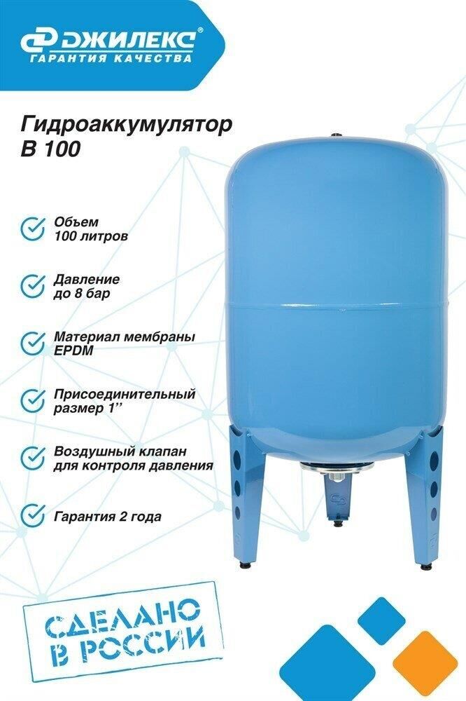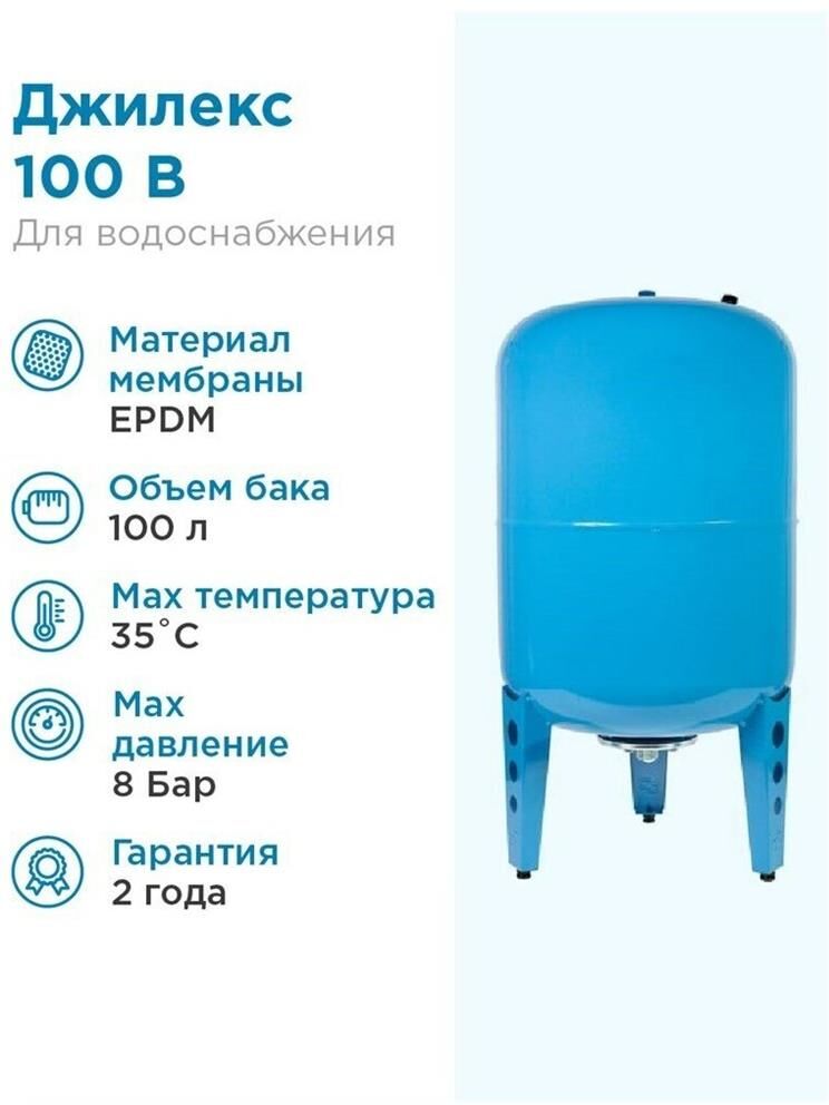 Объем100 л Максимальное давление8 Бар Цветсиний ОписаниеПредохраняет насос от частого включения. Снижает вероятность гидроудара в системе. При отключении напряжения выдает накопленный запас воды. Корпус из высококачественной стали. Воздушный клапан контроля давления воздуха. Воздушный клапан для контроля давления воздуха. Вертикальная компоновка. Срок гарантии24 мес.