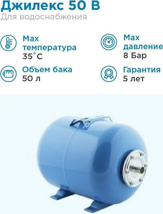 Объем50 л Максимальное давление8 Бар Цвет голубой Вертикальный гидроаккумулятор В 50 используется в системах автоматизированного водоснабжения совместно с поверхностными и погружными насосами.