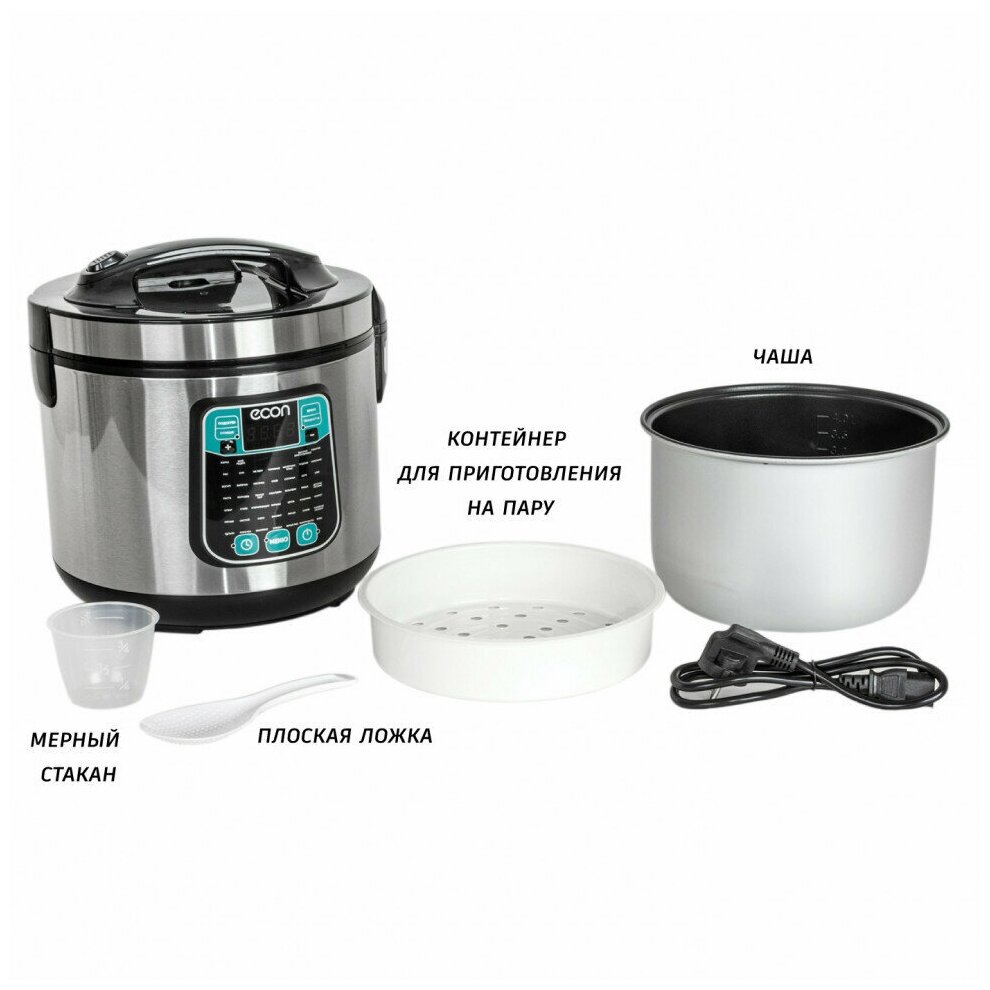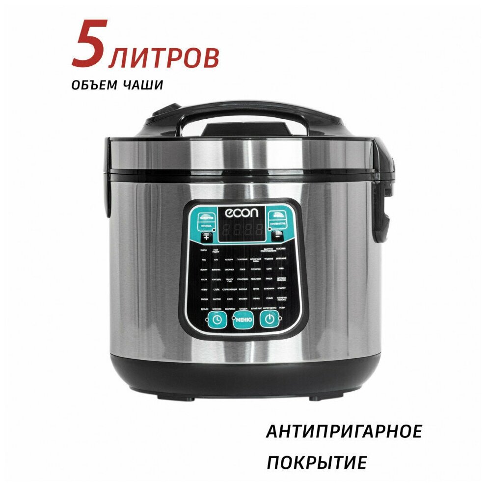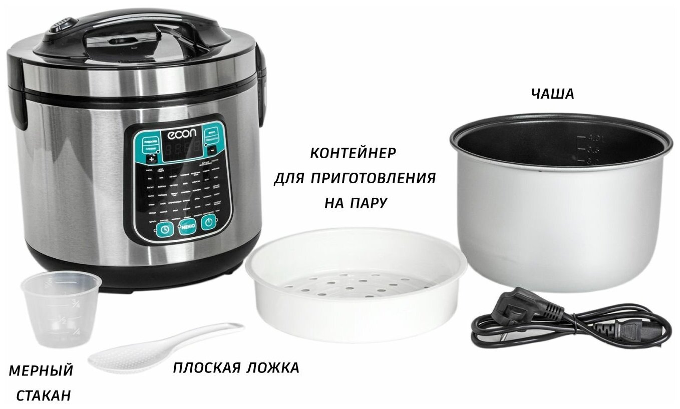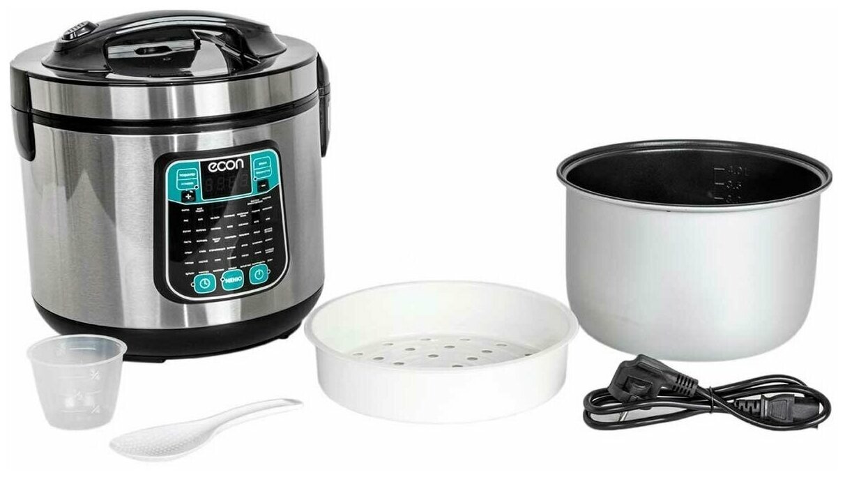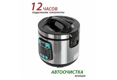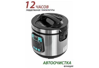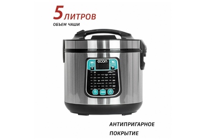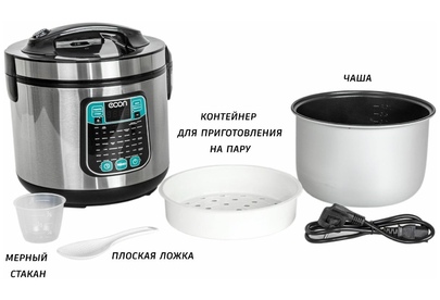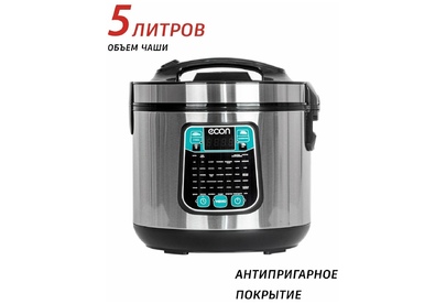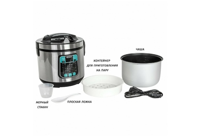 Мультиварка, мощность 860 ватт, объем чаши: 5 литров, объем чаши позволяет приготовить блюдо до 10 порций,45 автоматических программ c функцией мультиповар, антипригарное покрытие внутренней чаши – прочное и устойчивое к царапинам Daikin. Аксессуары: ложка, чаша для приготовления на пару, мерный стакан.