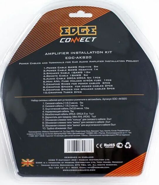 Кабель силовой 8Ga оранжевый - 5метров (ССА) Кабель силовой 8Ga черный - 1метр (ССА) Акустический кабель 16Ga - 12 метров (медь) Управляющий провод синий 18Ga - 5 метров (ССА) Межблочный кабель 2RCA-2RCA - 5 метров Держатель для предохранителя Mini-ANL - 1 штука Предохранитель Mini-ANL 40A - 1 штука Кольцо обжимное 8Ga - 2 штуки Вилка обжимная 8Ga - 2 штуки Вилки для подключения акустики 16Ga - 5 штук Втулка для 8Ga - 1 штука Обжимные трубки для 8Ga - 2 штуки Хомуты - 6 штук