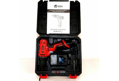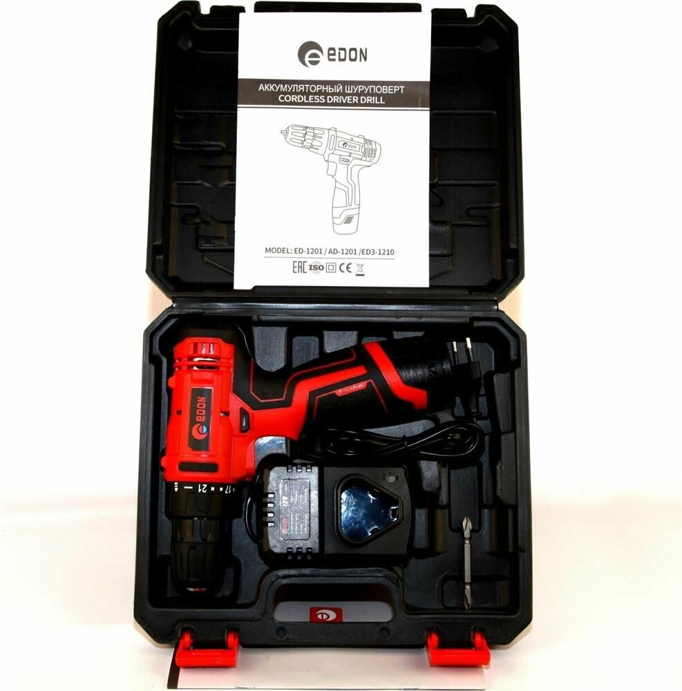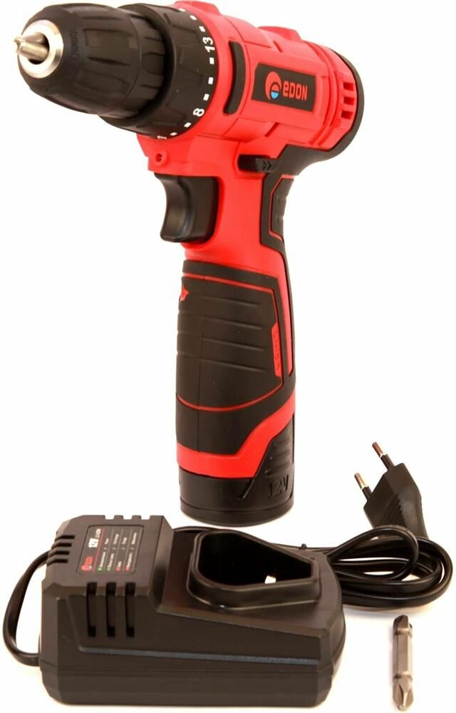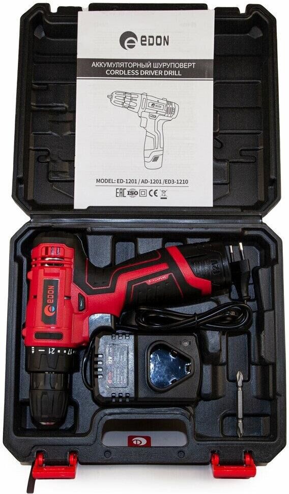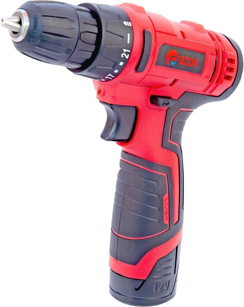 Дрель-шуруповерт аккумуляторная безударная Edon AD-1201, предназначена для закручивания, отворачивания винтов и шурупов, сверления отверстий в различных конструкционных материалах (в том числе металле, дереве, пластмассе и т.п.) Напряжение питания - 12 В.; Максимальная частота вращения (1/2 скорость) - (350 об/мин.; 1350 об/мин.); Емкость аккумулятора - 2 Ач.; Крутящий момент - 23 Нм.; Максимальный диаметр патрона - 10 мм.; Вес инструмента - 1 кг.