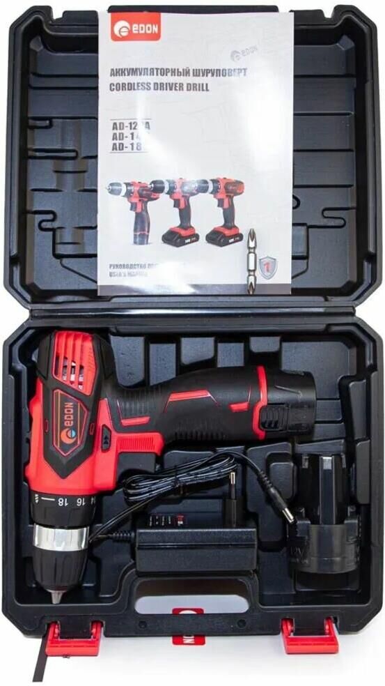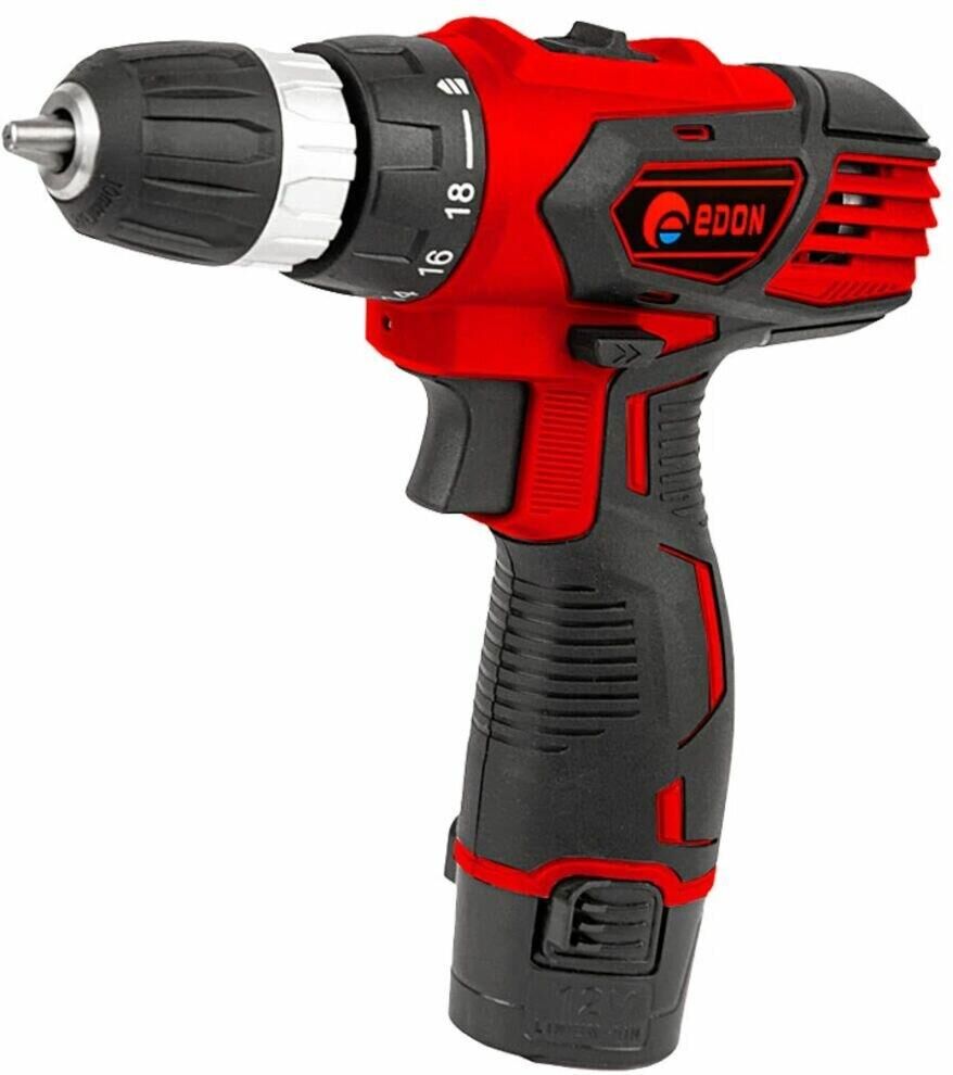 Дрель-шуруповерт аккумуляторная безударная Edon AD-12CA, предназначена для закручивания, отворачивания винтов и шурупов, сверления отверстий в различных конструкционных материалах (в том числе металле, дереве, пластмассе и т.д.). Максимальный крутящий момент - 23 Н•м.; Емкость аккумулятора - 2 А•ч.; Напряжение аккумулятора - 12 В.; Макс. число оборотов холостого хода: 0 - 350 об/мин.; 0 - 1350 об/мин.; Диаметр патрона, макс. - 10 мм.; Вес инструмента с аккумулятором - 0,97 кг.