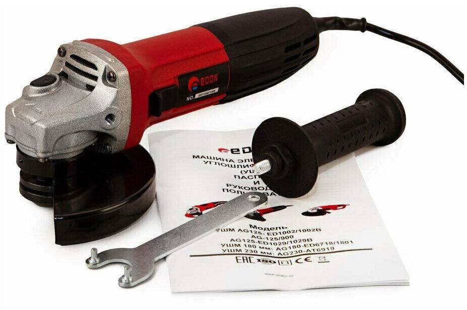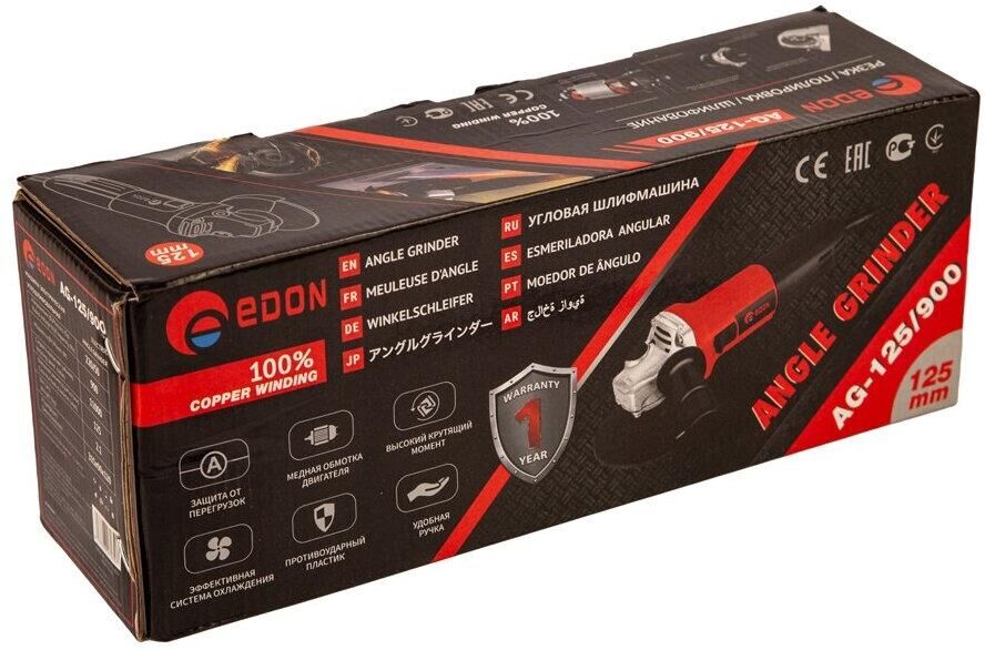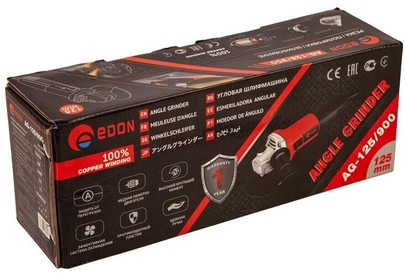 Угловая шлифовальная машина (УШМ болгарка) Edon AG-125/900 - электроинструмент, предназначенный для резки, шлифовки различных типов материалов и поверхностей. Особенности конструкции: - корпус редуктора из литого алюминия; - игольчатый опорный подшипник; - шестерни редуктора из инструментальной стали; - пылезащитный кожух; - подшипники закрытого типа; - двойная изоляция обмотки двигателя; - защита от перегрузок; - медная обмотка двигателя; - высокий крутящий момент; - эффективная система охлаждения; - противоударный пластик; - удобная укороченная ручка (корпус). Мощность - 900 Вт.; Макс. частота вращения диска - 11 000 об/мин.; Диаметр посадочного отверстия - 22 мм.; Макс. диаметр диска - 125 мм.; Длина сетевого кабеля - 2 м.;