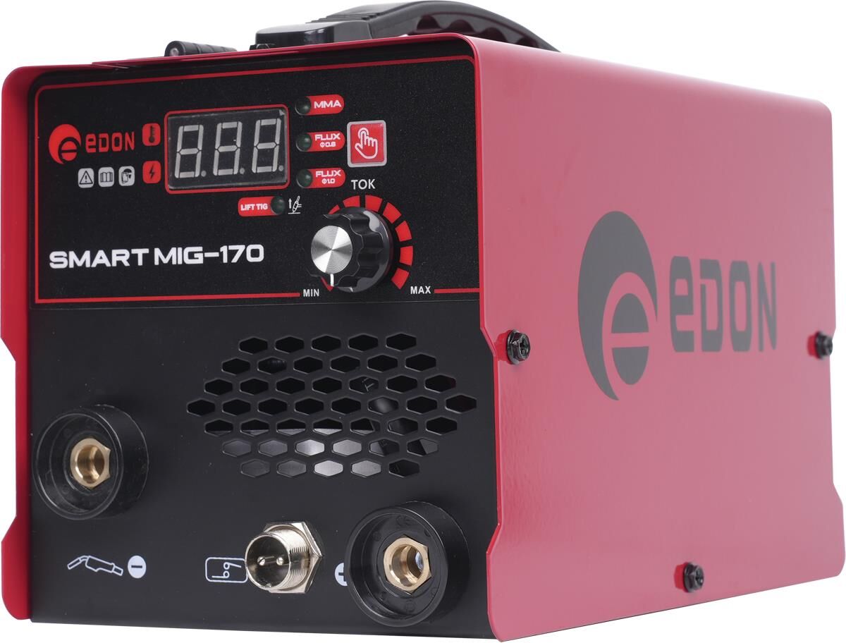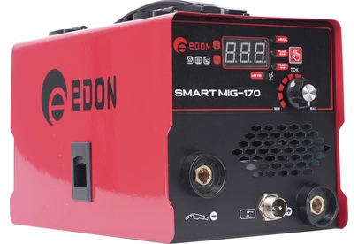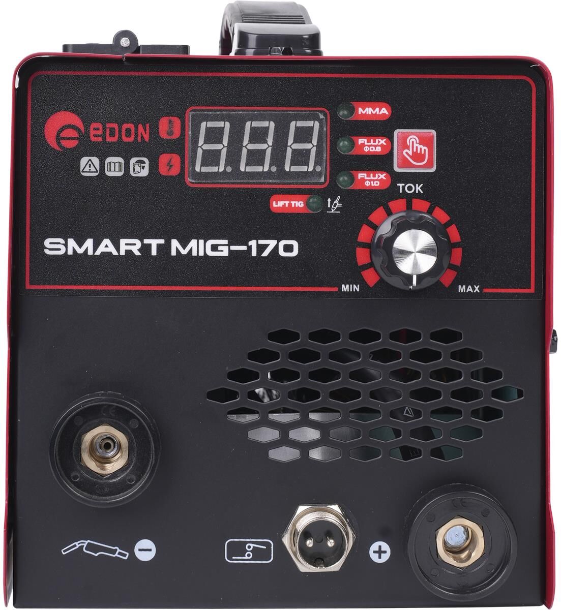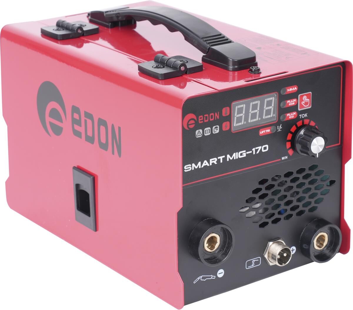 Сварочный аппарат Edon Smart MIG-170 без газа, MIG, MMA, FCAW. Сварочный инверторный полуавтомат с функцией ручной дуговой сварки) предназначен для ручной дуговой сварки ММА стальных металлоконструкций из низкоуглеродистых и низколегированных сталей штучными электродами с покрытием всех видов и размеров от 2,0 до 4,0мм, а также для сварки FCAW без газа порошковой (самозащитной) проволокой (с флюсом) диаметром 0,8-1,0мм. В данном сварочном полуавтомате предусмотрена функция LIFT TIG - это процесс дуговой сварки, при котором используется дуга, горящая между неплавящимся вольфрамовым электродом и изделием. Инверторные сварочные полуавтоматы используются для сварки изделий с повышенными требованиями к внешнему виду и форме шва. Инвертор предназначен для работы от однофазной сети 220В(± 10%).