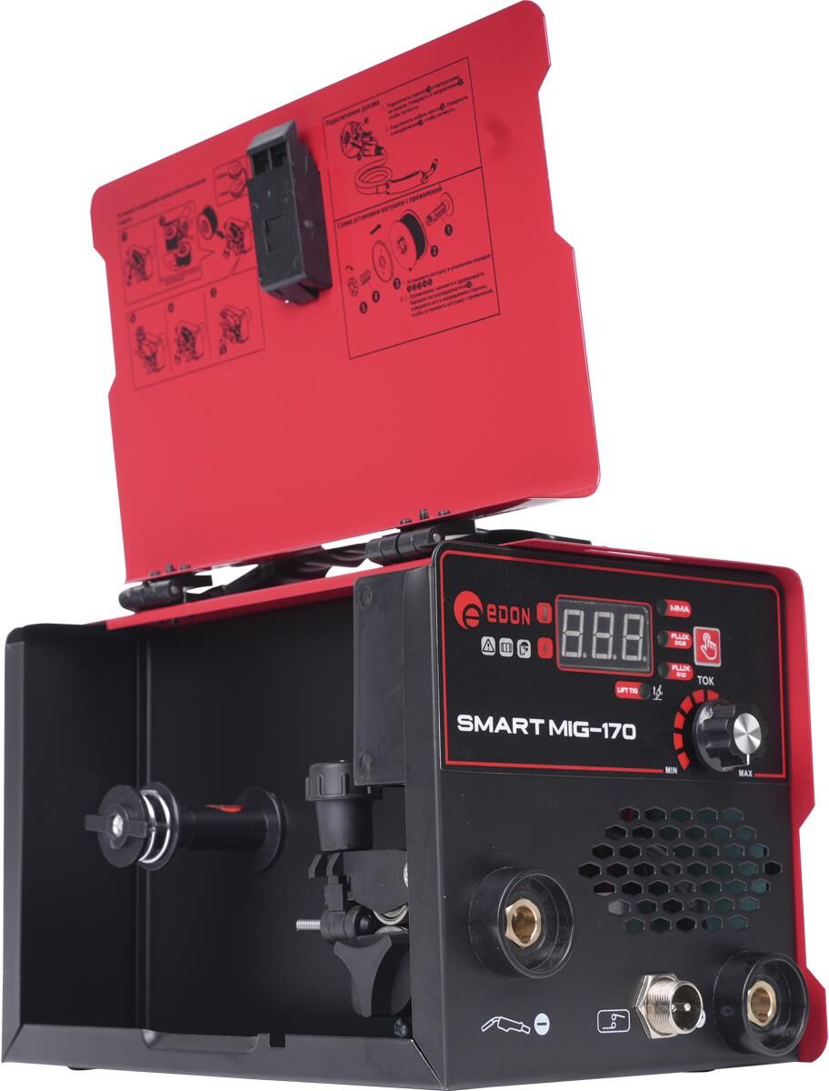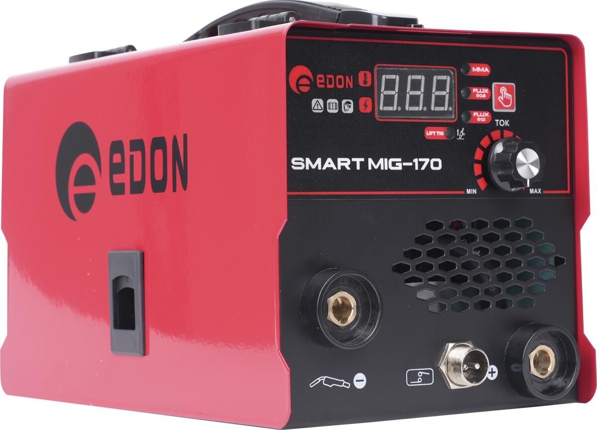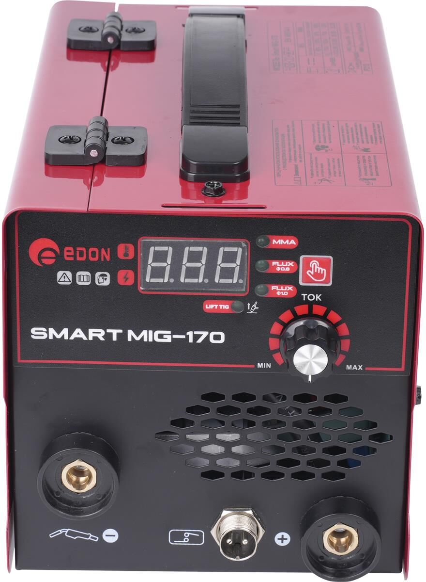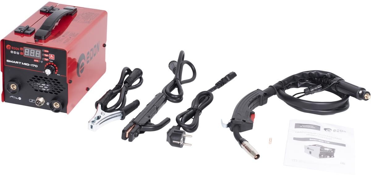 Сварочный аппарат Edon Smart MIG-170 без газа, MIG, MMA, FCAW. Сварочный инверторный полуавтомат с функцией ручной дуговой сварки) предназначен для ручной дуговой сварки ММА стальных металлоконструкций из низкоуглеродистых и низколегированных сталей штучными электродами с покрытием всех видов и размеров от 2,0 до 4,0мм, а также для сварки FCAW без газа порошковой (самозащитной) проволокой (с флюсом) диаметром 0,8-1,0мм. В данном сварочном полуавтомате предусмотрена функция LIFT TIG - это процесс дуговой сварки, при котором используется дуга, горящая между неплавящимся вольфрамовым электродом и изделием. Инверторные сварочные полуавтоматы используются для сварки изделий с повышенными требованиями к внешнему виду и форме шва. Инвертор предназначен для работы от однофазной сети 220В(± 10%).