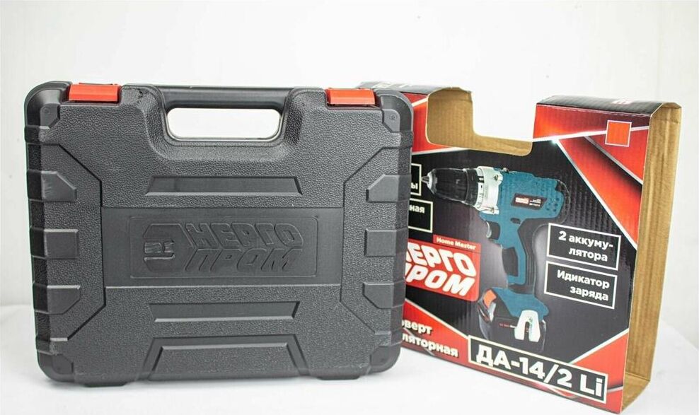 дрель-шуруповерт, 2 аккумулятора, зарядное устройство, двухсторонняя бита, инструкция, пластиковый кейс