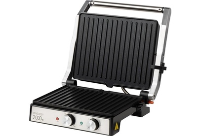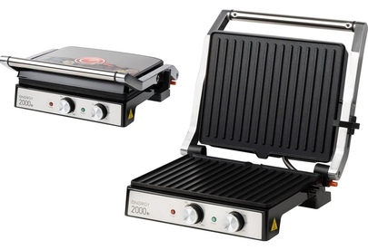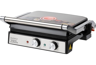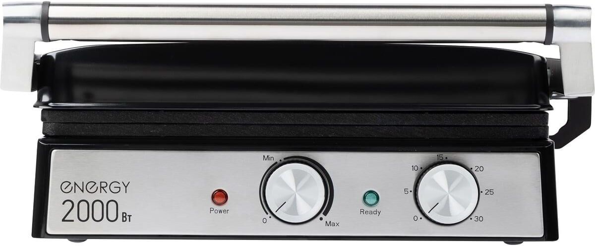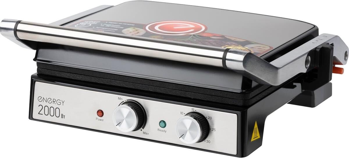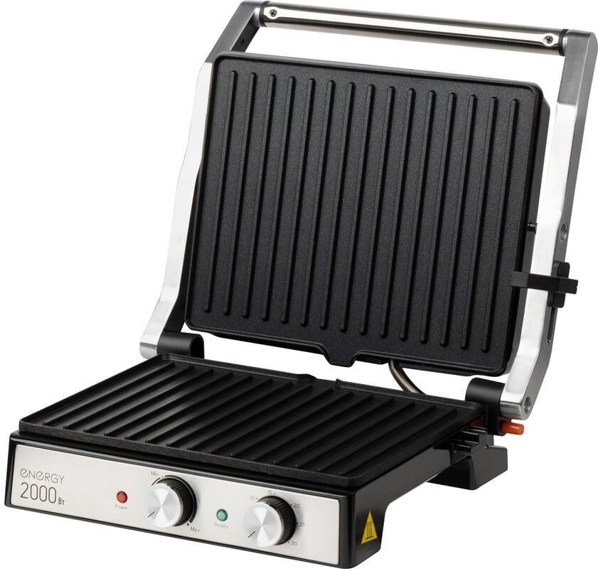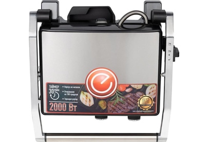 Гриль Световой индикатор работы и нагрева Терморегулятор Таймер на 30 минут Ненагревающаяся ручка Прорезиненные ножки Корпус их термостойкого пластика и металла Открывание на 180 градусов Мощность 2000Вт Размер: 29*23см Длина шнура 75 см
