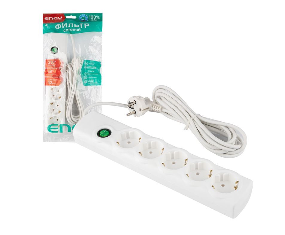ENGY Сетевой фильтр ENGY "Сеть-2" 3м/5 роз. (ПВС 3*0,75) белый 186758
