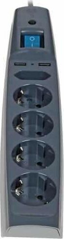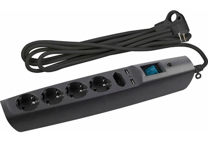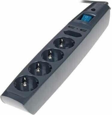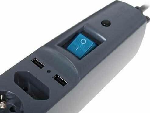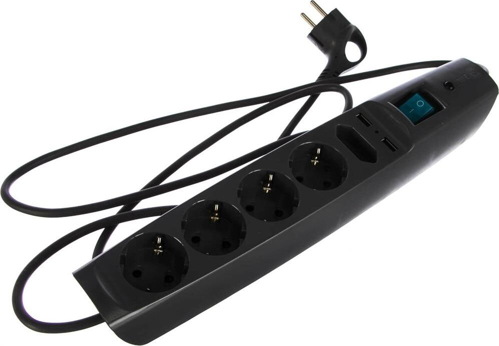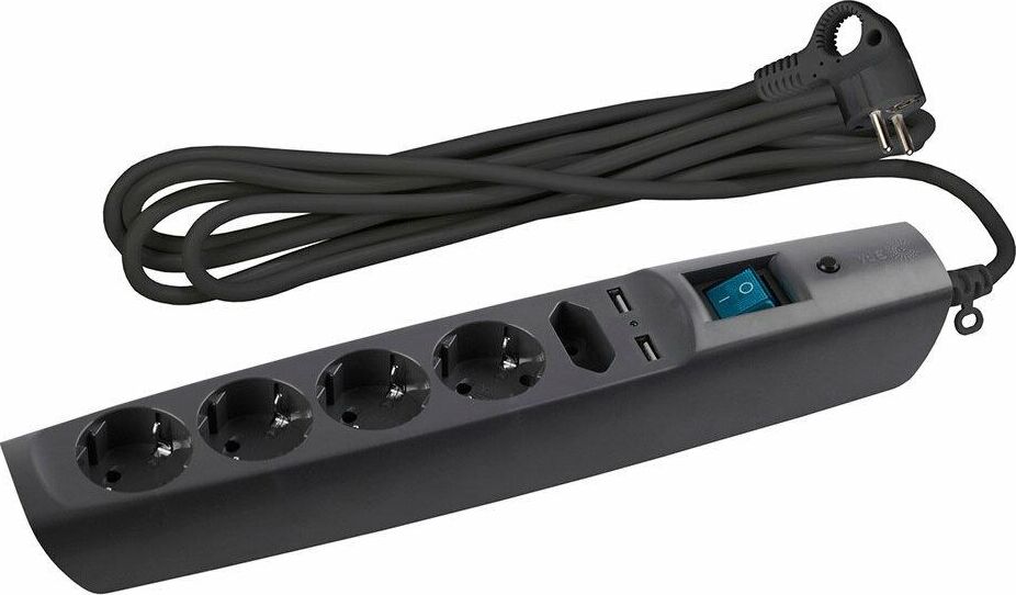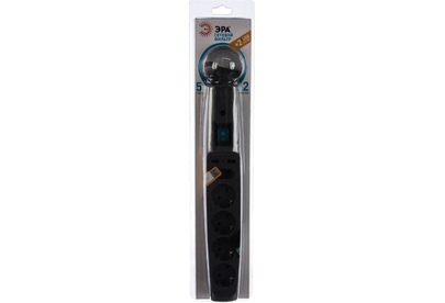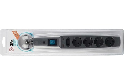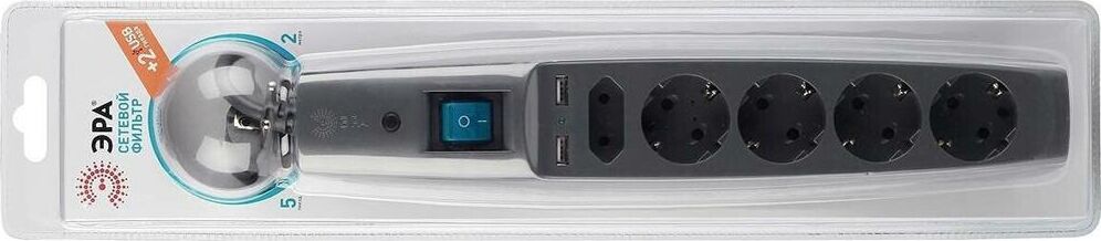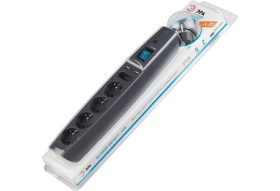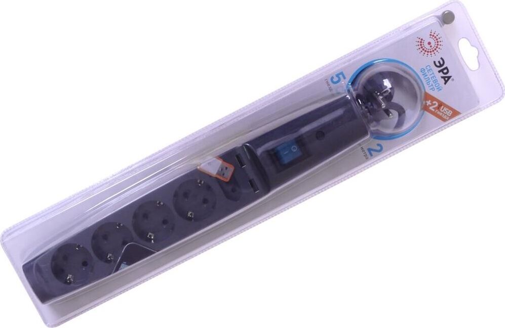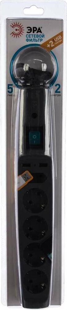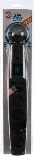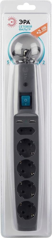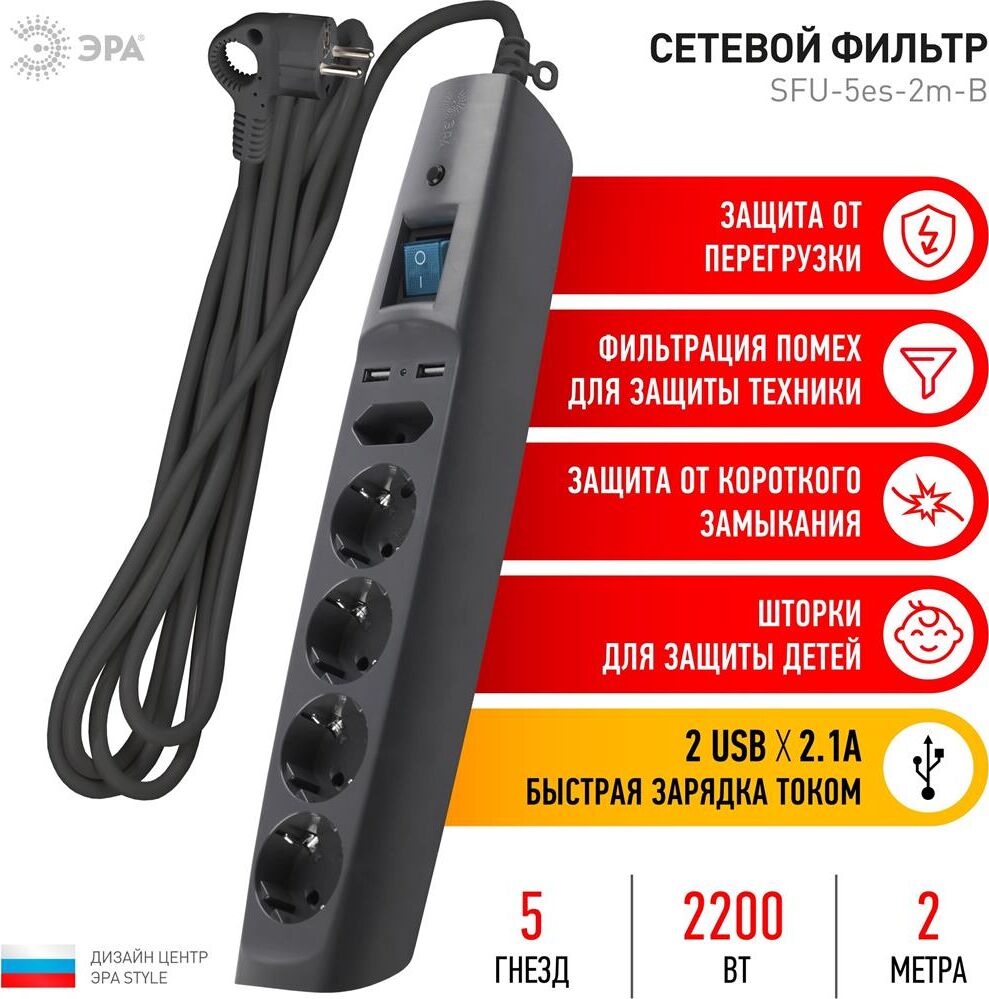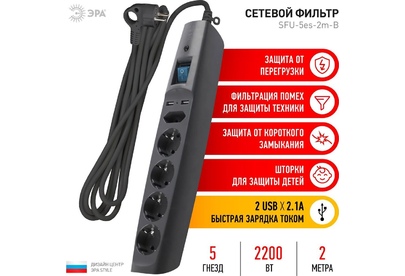 Сетевой фильтр пятиместный 2 м SFU-5es-2m-B "Эра" (10 А, надежный уровень защиты, 2 USB) с заземлением и защитными шторками, с выключателем, черный Мощный сетевой фильтр "Эра" серии SFU (надежный уровень защиты): защита аудио-, видеотехники, компьютеров, телефонов и другой техники от скачков напряжения, высокочастотных и импульсных помех (источники помех: дрель, пылесос, сварочный аппарат и др, подключение и отключение мощных энергопотребителей на подстанции)