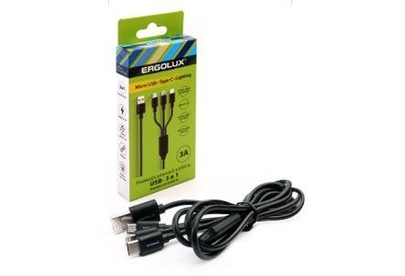 ERGOLUX (15099) ELX-CDC05-C02 (Кабель 3в1- Micro USB-Lightning-Type C, 3А, 1,2м, Черный, Зарядка, Ко