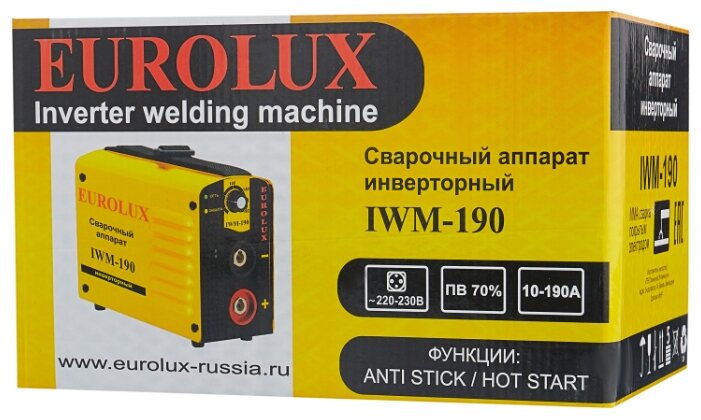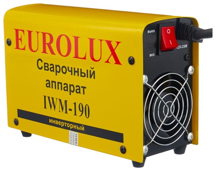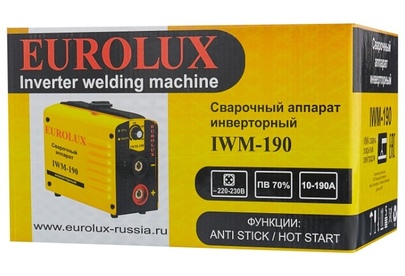Сварочный аппарат EUROLUX IWM190. Диапазон сварочного тока, А – 10-190; Входное напряжение, В – 160-260; Максимальный диаметр электрода, мм - 5; Гарантия, мес - 12;