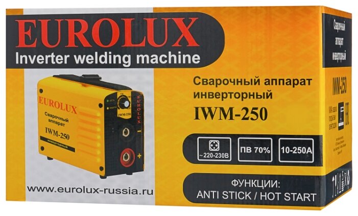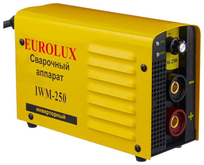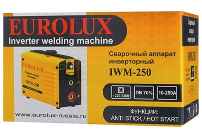 Сварочный аппарат EUROLUX IWM250. Диапазон сварочного тока, А – 10-250; Входное напряжение, В – 160-260; Максимальный диаметр электрода, мм - 5; Гарантия, мес - 12;