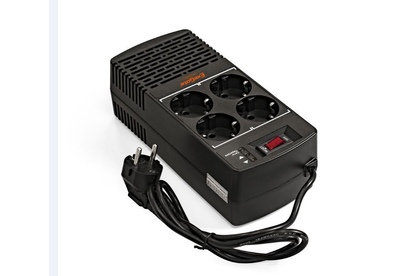 Стабилизатор релейный, предназначен для коррекции напряжения в сетях электроснабжения, выходная мощность - полная 600 ВА,активная - 300 ВТ ; количество выходных розеток - 4 EURO , входное напряжение,В: 150 - 280, выходное напряжение, В: 220 , защита от повышенного/пониженного напряжения, высоковольтных импульсов, короткого замыкания, перегрузки и перегрева , индикация входных/ выходных параметров: LED .