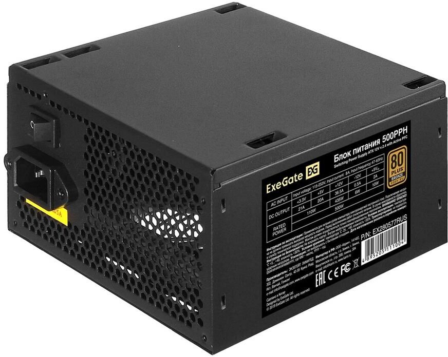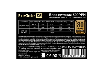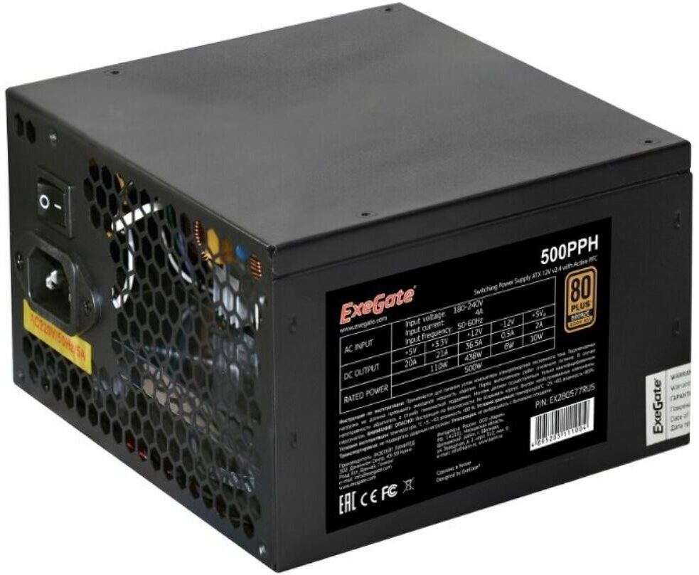 EXEGATE Блок питания 500PPH, 500Вт, 80 PLUS BRONZE, 120мм, черный [ex280577rus-oem]