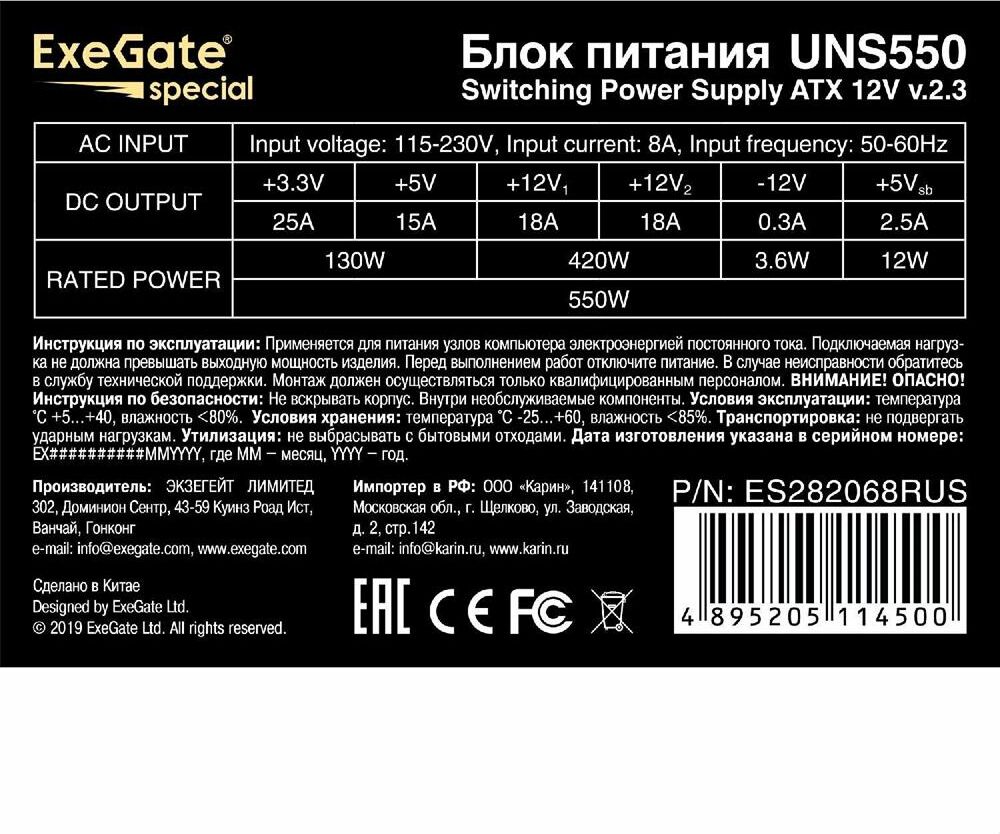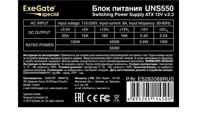 Exegate ES282068RUS Блок питания 550W ExeGate Special UNS550, ATX, 12cm fan, 24p+4p, 6/8p PCI-E, 3*S