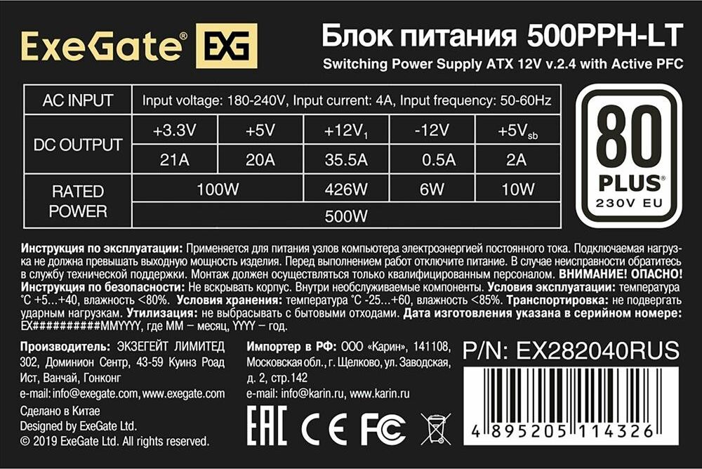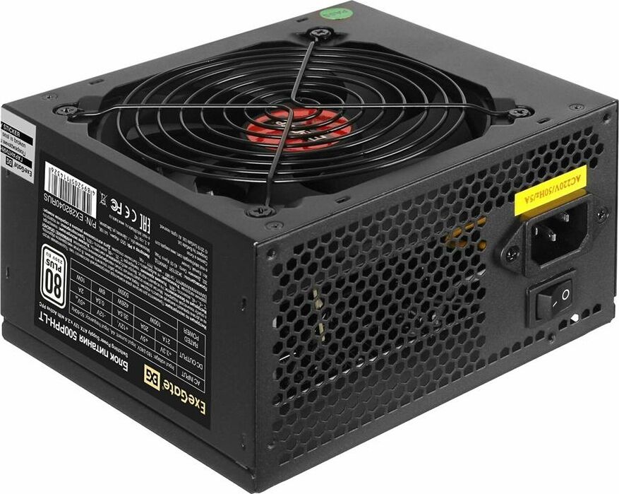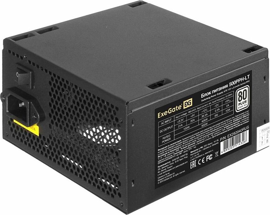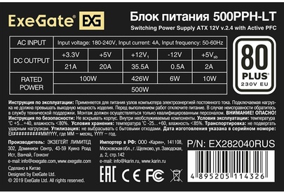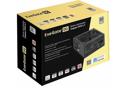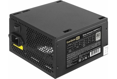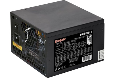 Exegate EX282040RUS Блок питания 500W Exegate 500PPH-LT, 80+,RTL ATX, black, APFC, 12cm, 24p, (4+4)p