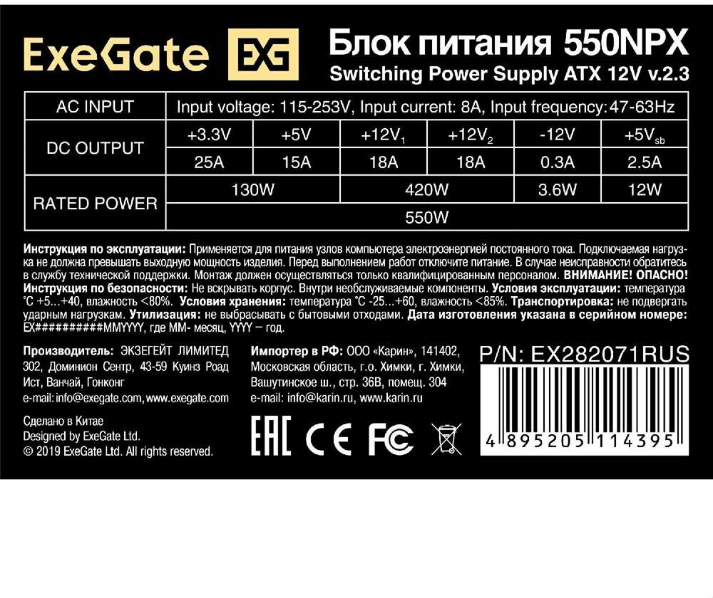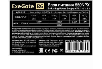 Exegate EX282071RUS Блок питания 550W ExeGate 550NPX, ATX, black,12cm fan, 24p+4p, 6/8p PCI-E, 3*SAT
