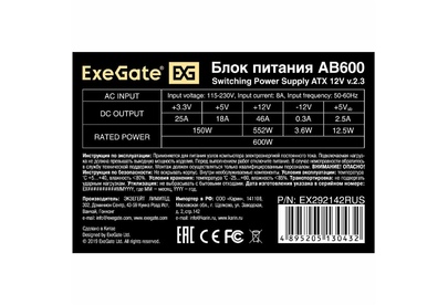 EXEGATE EX292142RUS Блок питания 600W AB600 (ATX, 8cm fan, 24pin, 4pin, 3xSATA, 2xIDE, FDD)