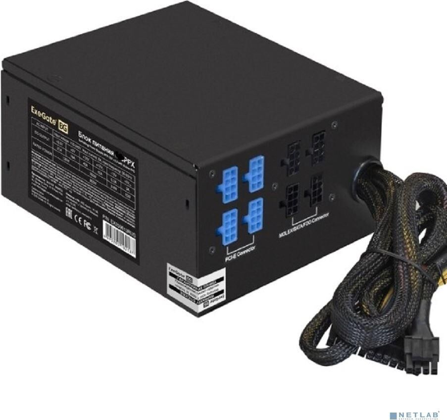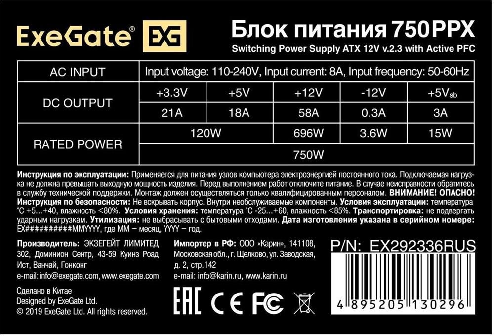 EXEGATE EX292336RUS Блок питания 750W 750PPX (ATX, APFC, КПД 80% (80 PLUS), 14cm fan, 20+4pin, 2x(4+