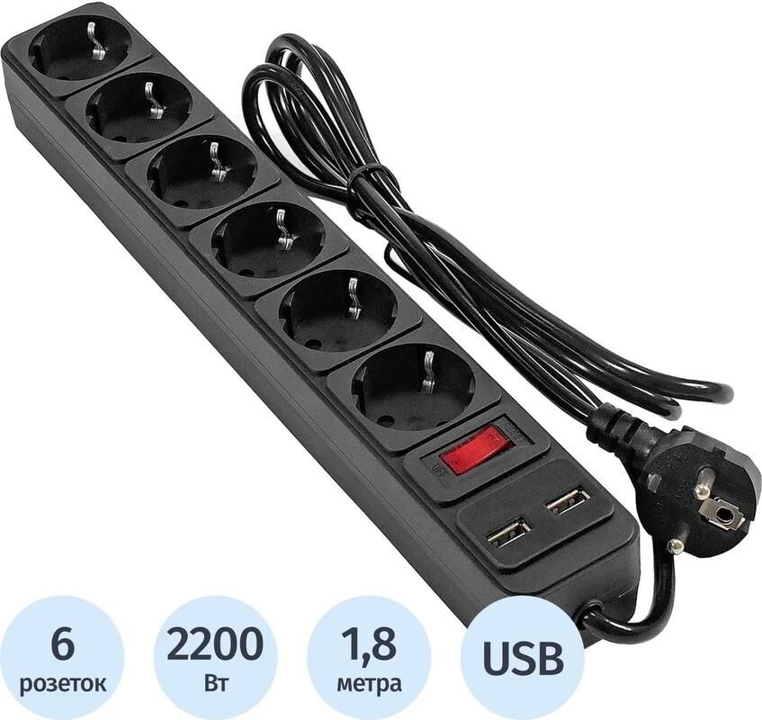 Сетевой фильтр-удлинитель с USB зарядкой ExeGate SP-6-USB-1.8B (6 евророзеток с заземлением, 2 USB-A 2A, 1.8м, защита от перегрузки, выключатель с подсветкой, черный)