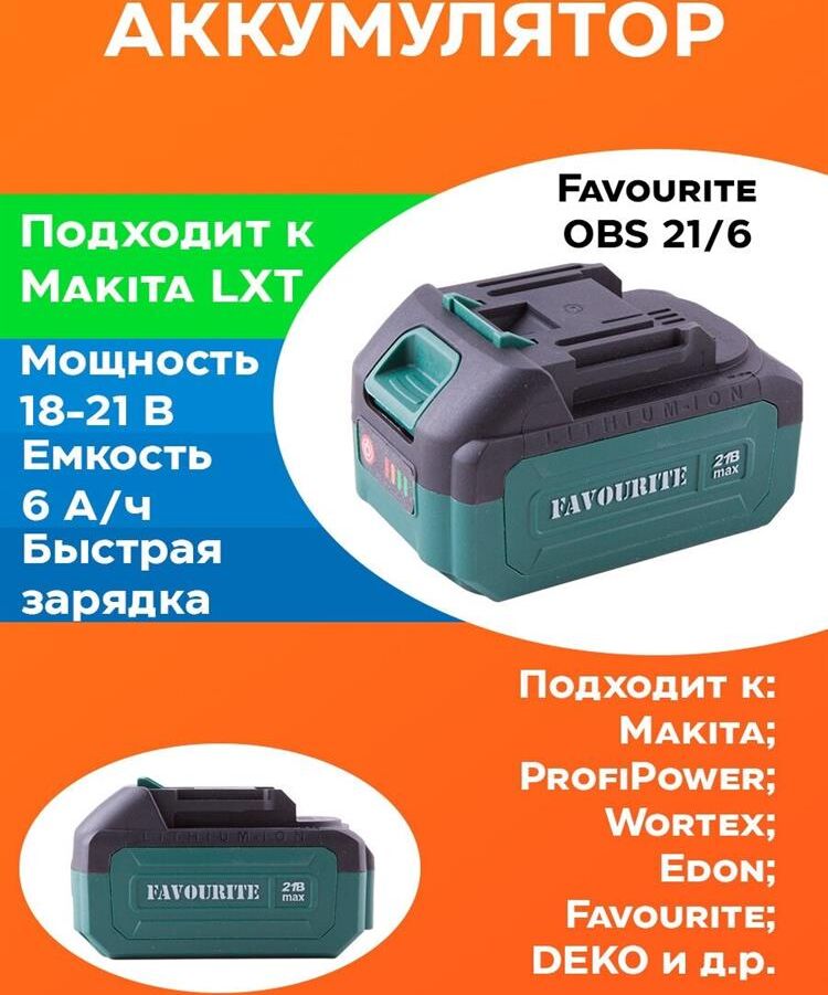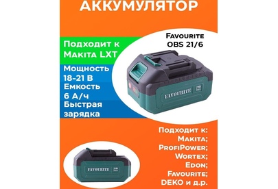 Универсальная аккумуляторная батарея FAVOURITE OBS 21/6, предназначена для линейки аккумуляторного инструмента ТМ FAVOURITE - ONE BATTERY SYSTEM. Тип батареи - Li-ion Пиковое напряжение - 21 В Емкость батареи - 6 Ач, подходящее зарядное устройство для данной батареи: OBS 1,1 и OBS 1,3