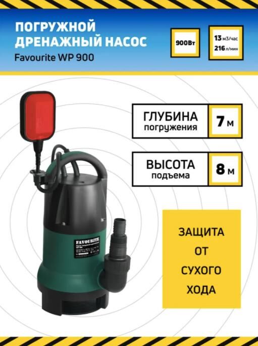 Напряжение / частота (Гц) 220 В / 50 Гц Потребляемая мощность (Вт) 900 Макс. производительность (м3/час) 13 Максимальный напор (м) 8 Макс. глубина погружения (м) 7 Температурный режим от +4 до +35 Диаметр подключений 1`` 1(1/2)`` 1(1/4)`` Макс. диаметр фракций 35 мм Степень защиты IPX8 Класс защиты I Вес 4,3 Патрубок выходной Да Руководство по эксплуатации Да