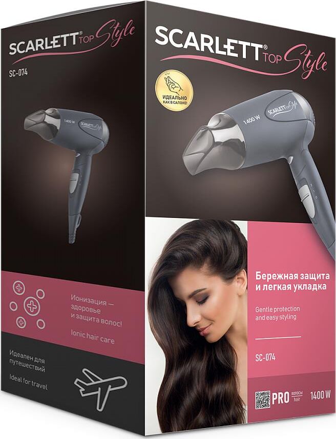 Мощ:1400 Вт Корпус из термост. пласт. 2 режима температуры потока воздуха 2 режима мощности потока воздуха Насадка-концентратор для укладки волос Холодный обдув для завершения укладки и фиксации прически Складная ручка Авто отключение при перегреве Защита