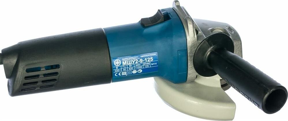 Машина шлифовальная угловая ручная электрическая МШУ2-9-125 - изделие на 90% состоит из деталей и комплектующих отечественного производства, применяется для жестяных работ в производственных и бытовых условиях, благодаря небольшим размерам, инструментом удобно пользоваться в труднодоступных местах, дополнительная рукоятка может устанавливаться в двух положениях, имеется легкий доступ к щеткам, мощность 920 Вт, скорость вращения 11000 об/мин, диаметр диска 125 мм, резьба ведущего шпинделя М14, гарантийный срок эксплуатации - 24 мес.+ 12 месяцев при регистрации изделия на официально сайте производителя.