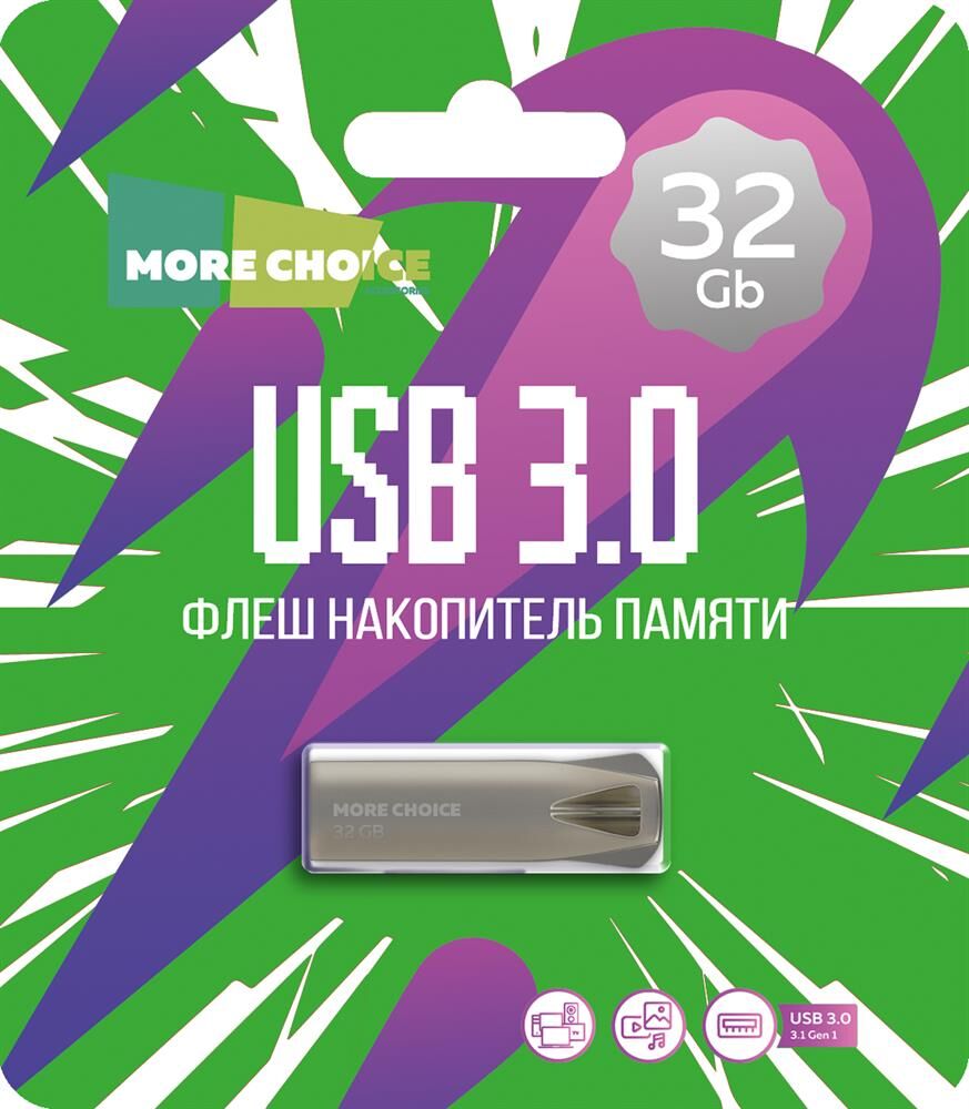 Производитель MORE CHOICE; Объем памяти 32 Гб; Выдвижной разъем Нет; Форм-фактор Стандарт; Водонепроницаемый корпус Нет