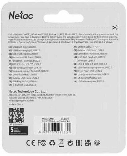 Флешка (USB) NETAC Флешка USB UM81 8ГБ, USB2.0, черный [nt03um81n-008g-20bk]