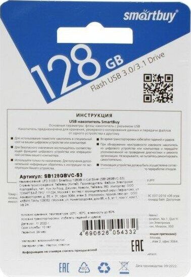 Объем памяти: 128 ГБ Интерфейс: USB 3.0 Скорость чтения данных: 45 МБ/с
