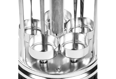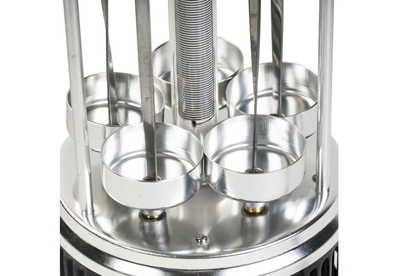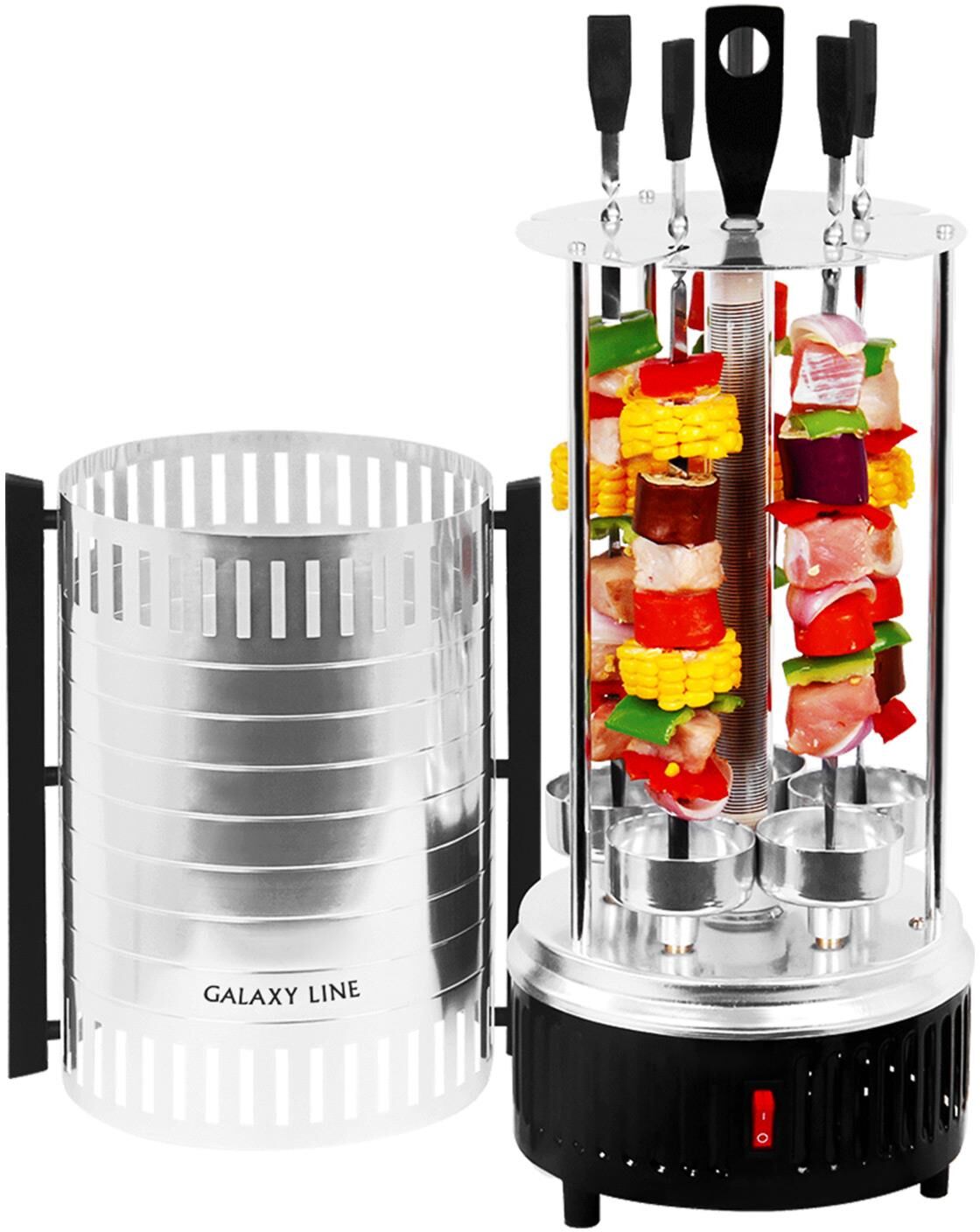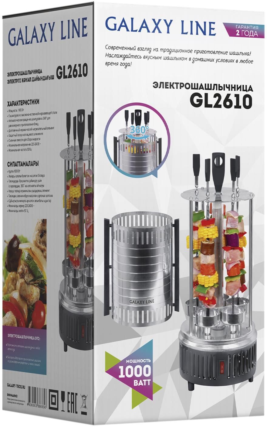 GALAXY GL 2610 Мощность 1000 Вт. 5 шампуров из высококачественной нержавеющей стали. Автоматическое вращение шампуров на 360° для равномерного приготовления блюд. Долговечный керамический нагревательный элемент. Защитный кожух из пищевого алюминия. Съемные емкости для сбора жидкости. Напряжение сети 220-240 В. Частота 50 Гц.