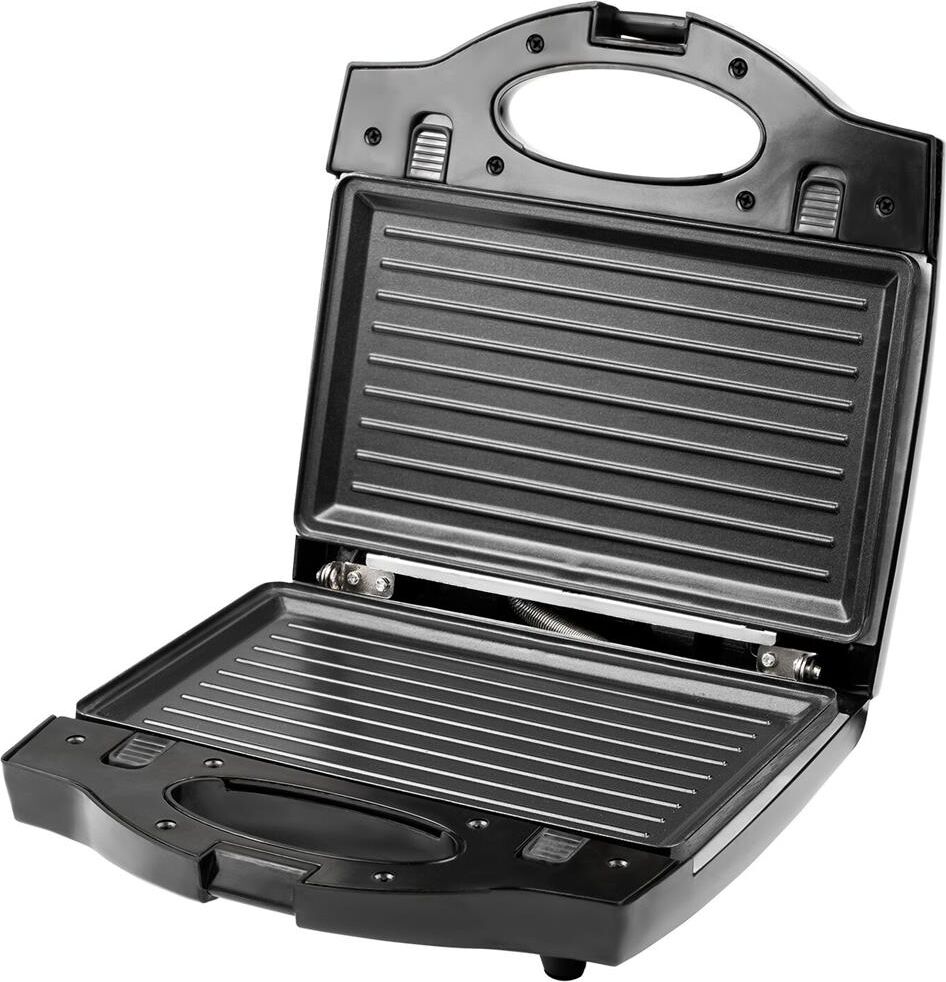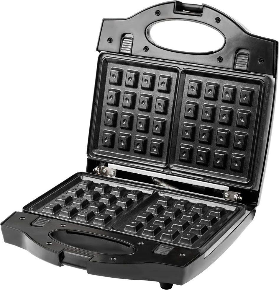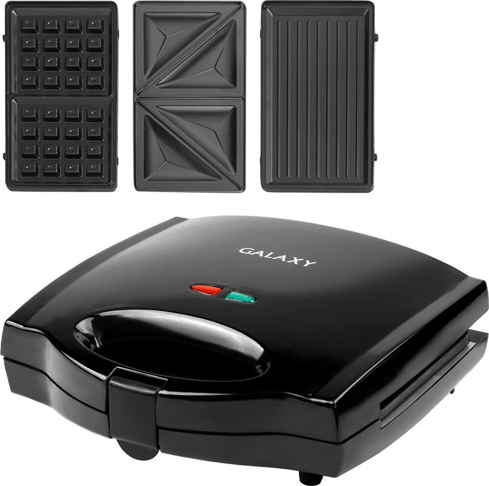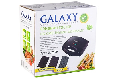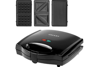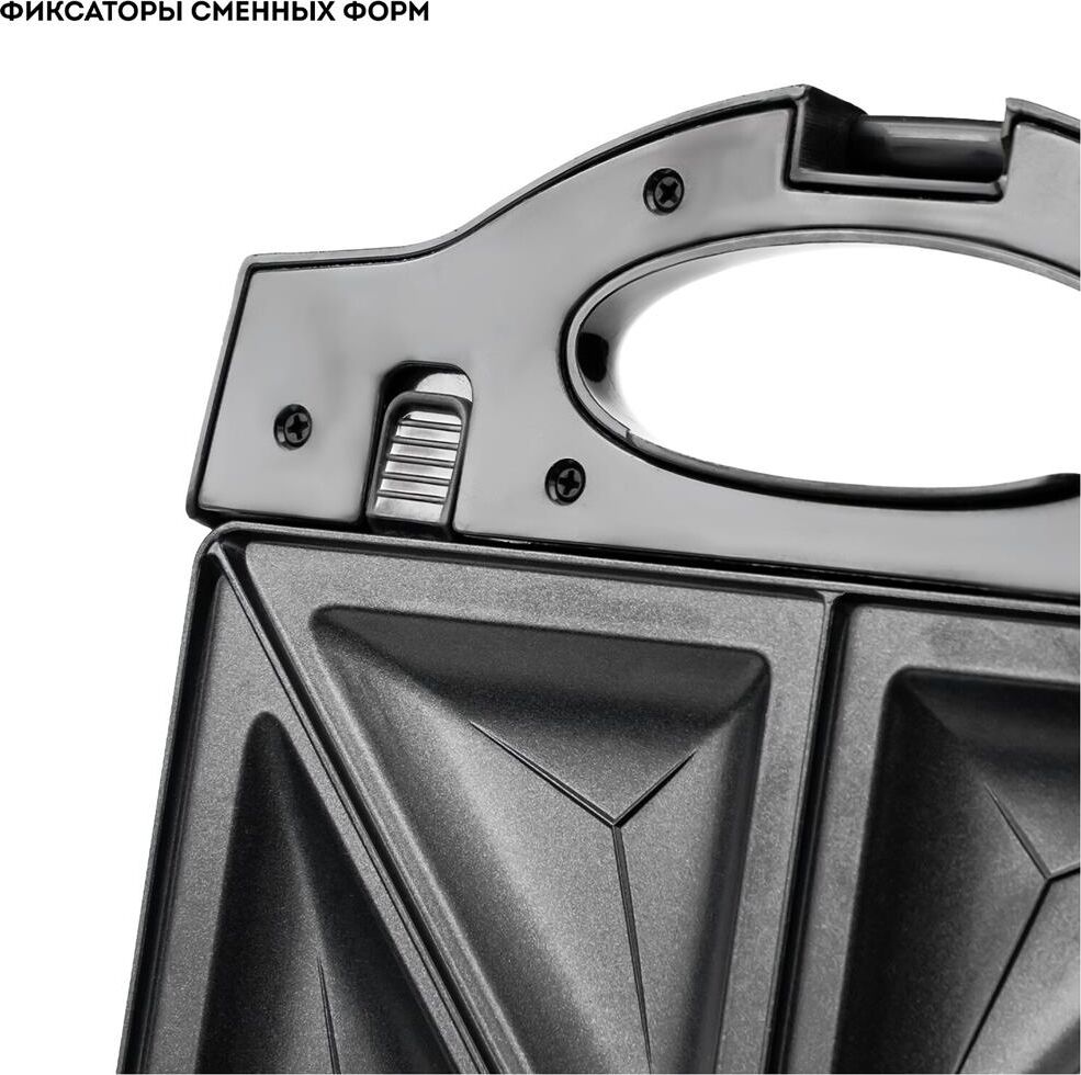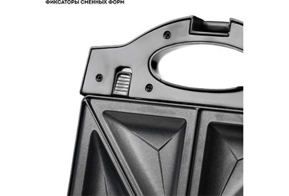 Мощность 800Вт. Термоизоляционный корпус. 3 сменные двойные формы для приготовления тостов и сэдвичей, Венских вафель, блюд на гриле. Фиксаторы сменных форм. Антипригарное покрытие рабочей поверхности. Индикаторы сети и нагрева.